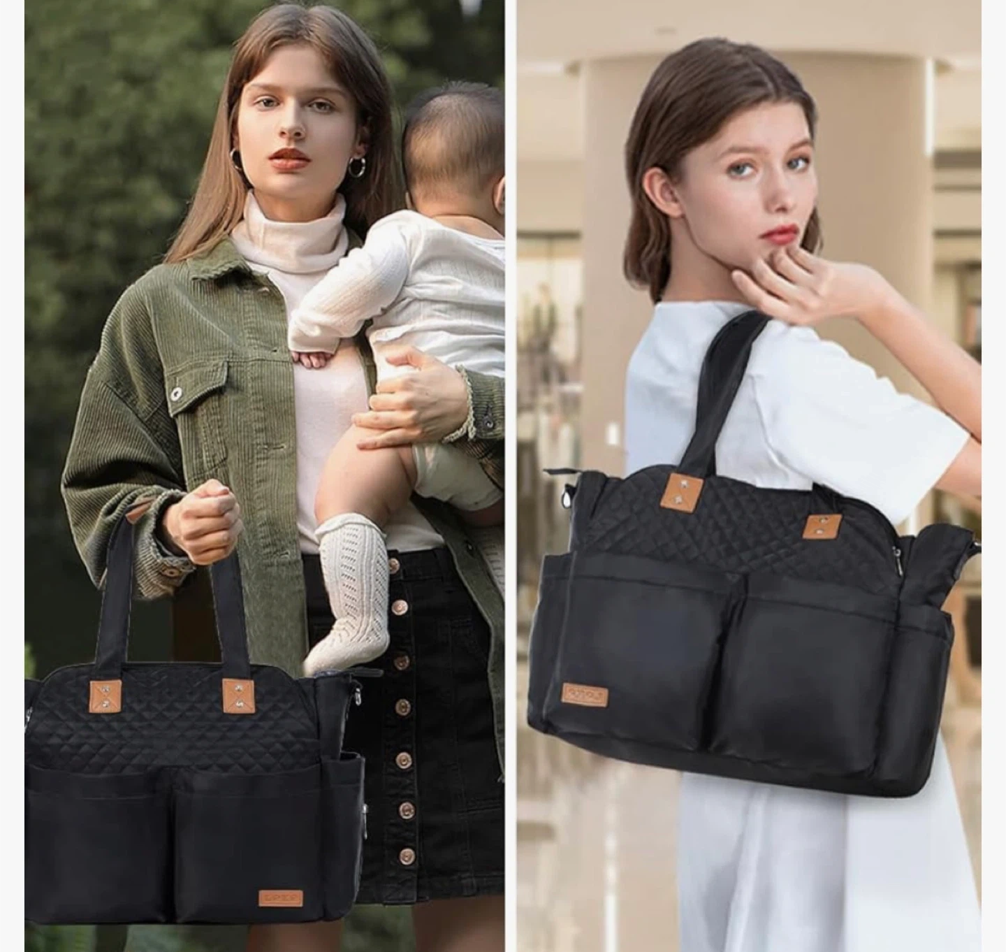 This black quilted diaper bag has a magnetic closure and 17 pockets, including 2 insulated bottle holders. It comes with an adjustable messenger strap and a matching changing pad. Dimensions: 14.96" W x 6.3" D x 13.78" H.