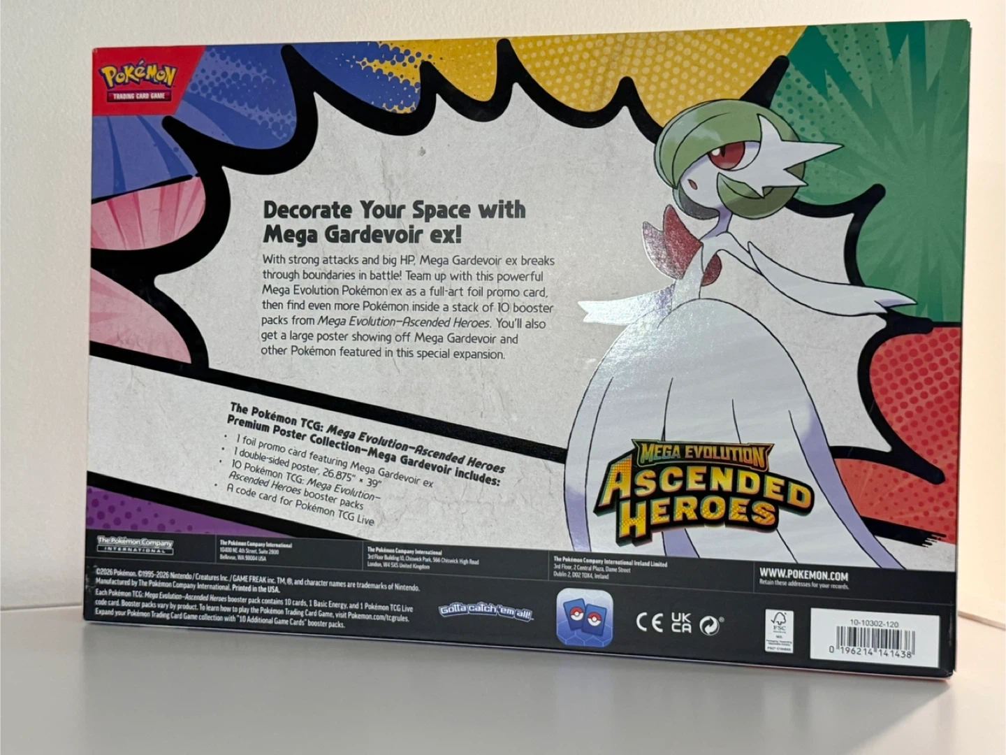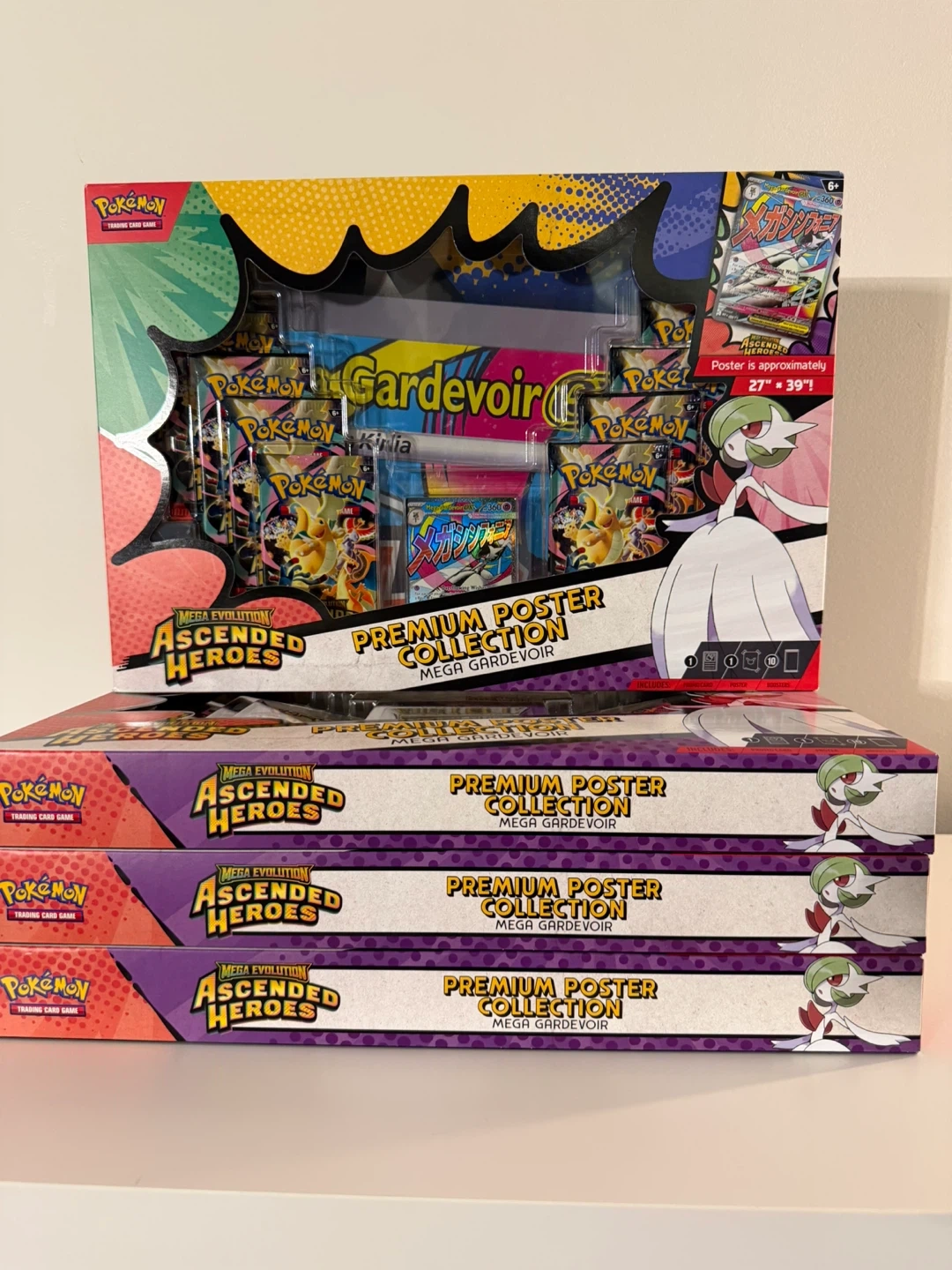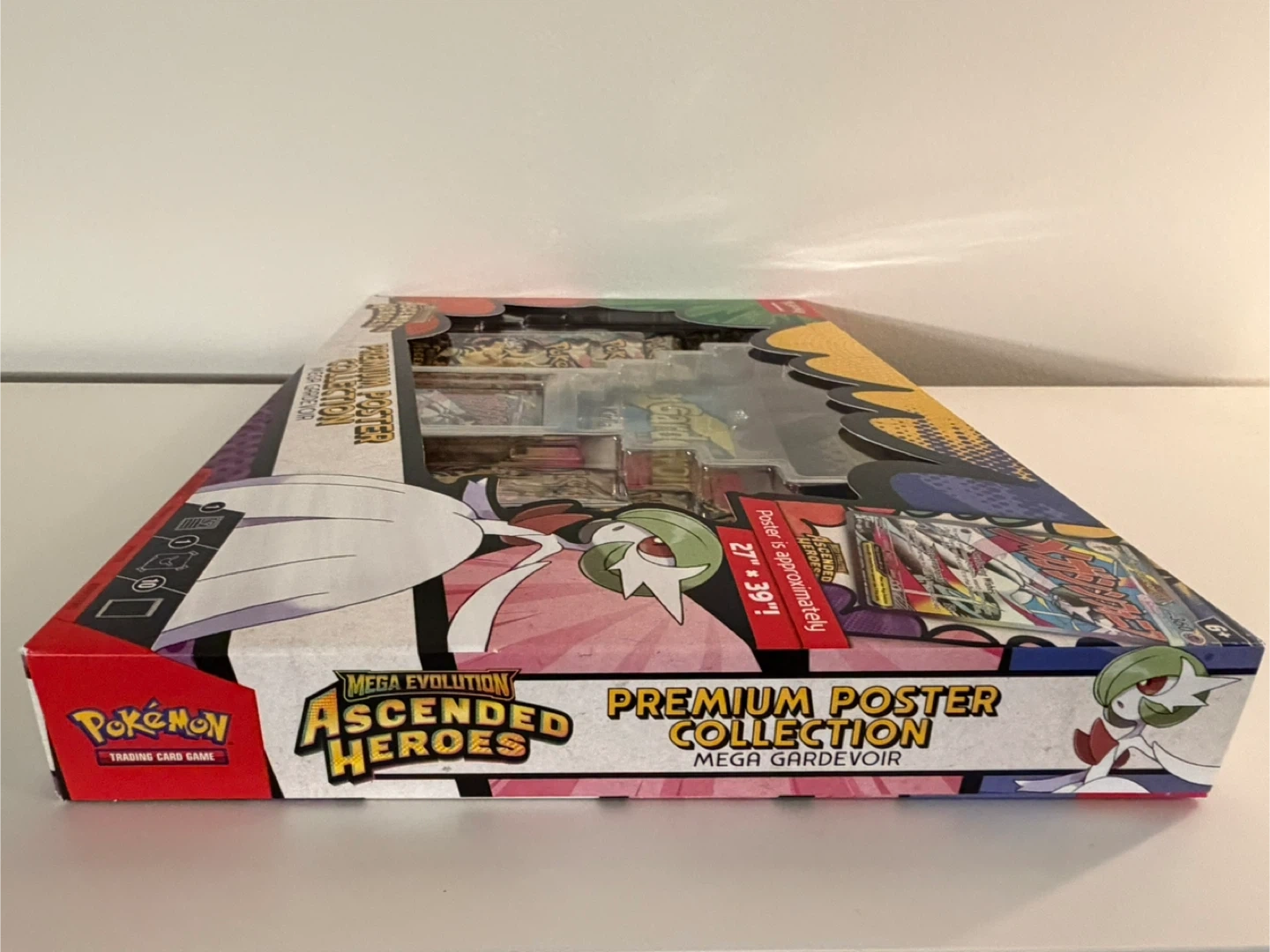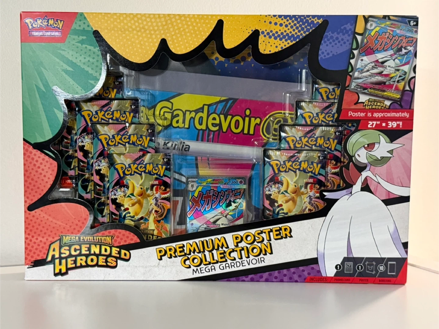 This Pokemon TCG Mega Evolution Ascended Heroes Premium Poster Collection features Mega Gardevoir. It includes 1 foil promo card, 1 double-sided poster (27" x 39"), 10 Pokemon TCG booster packs, and a code card for Pokemon TCG Live. Expand your collection with this special set!