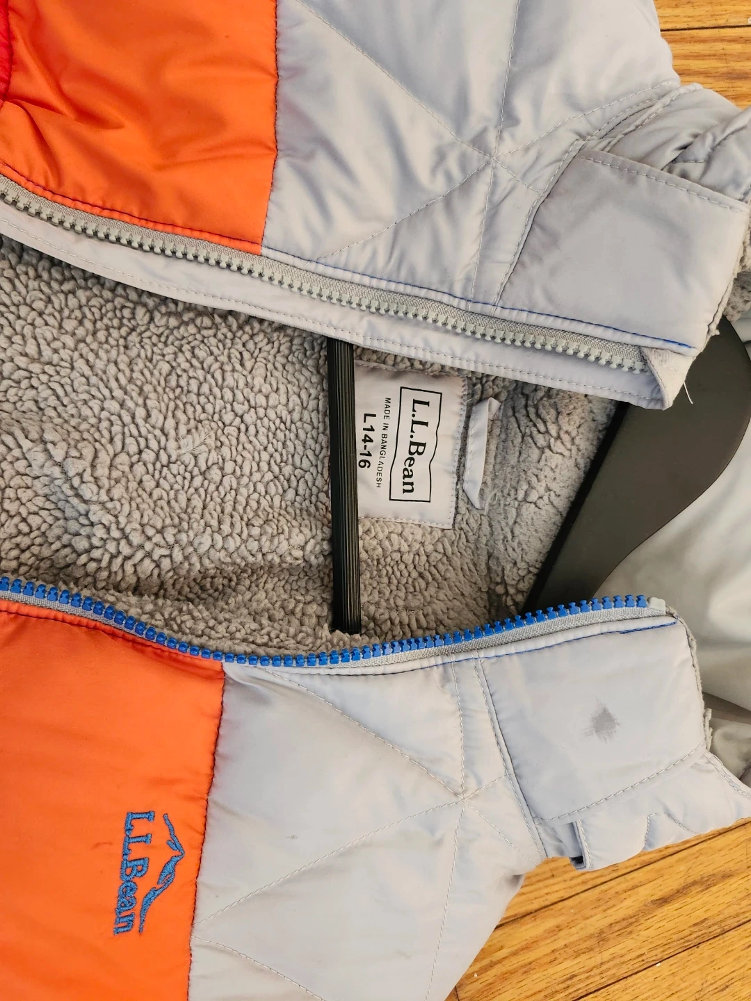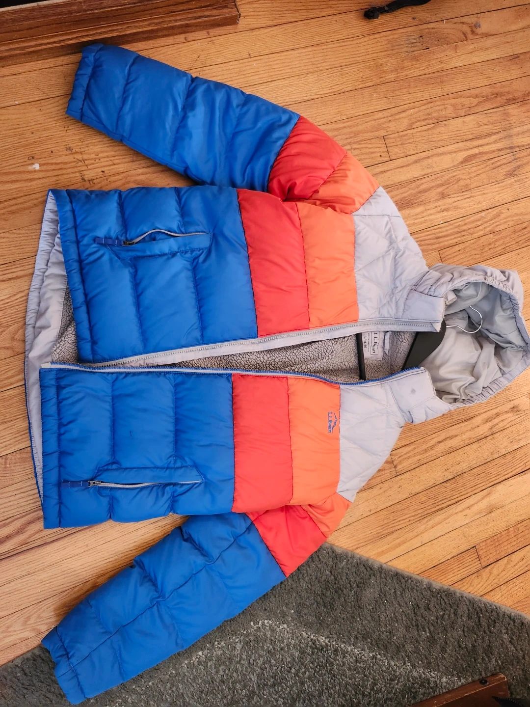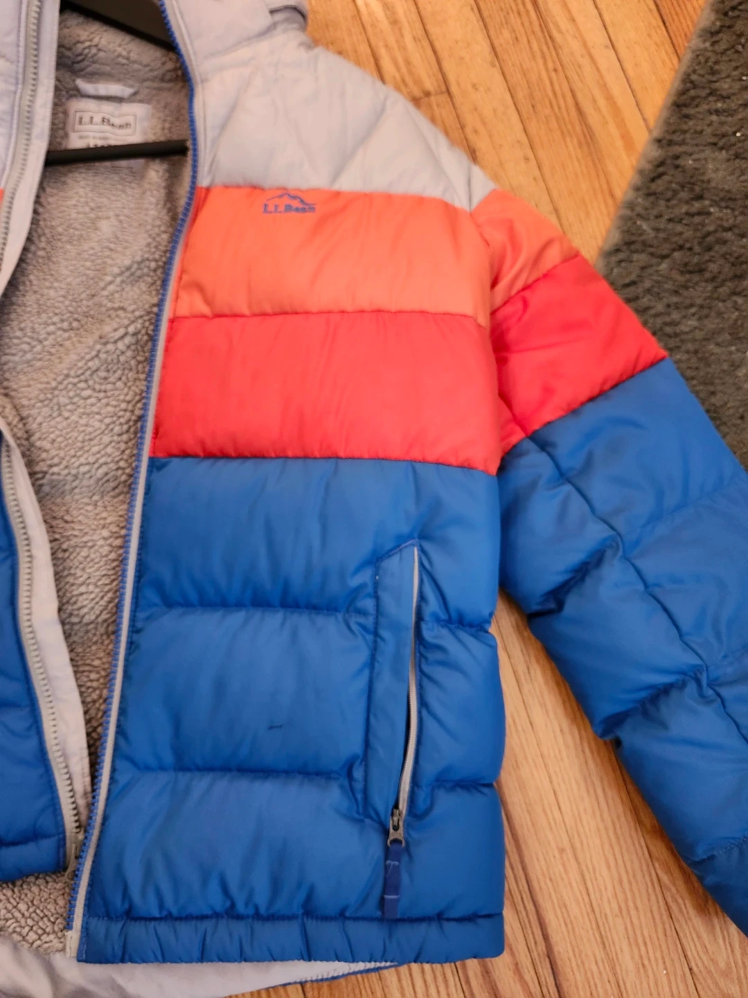 This L.L.Bean puffer jacket features a cozy sherpa lining and a colourful block design. It's a youth size large, fitting sizes 14-16. Perfect for keeping warm on chilly days!