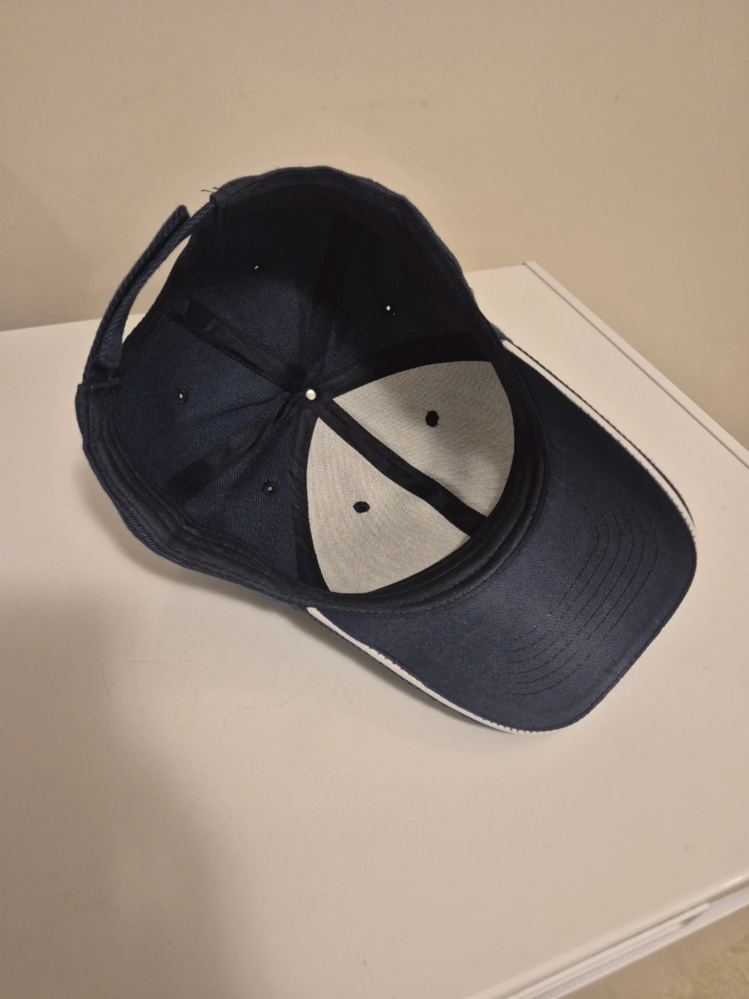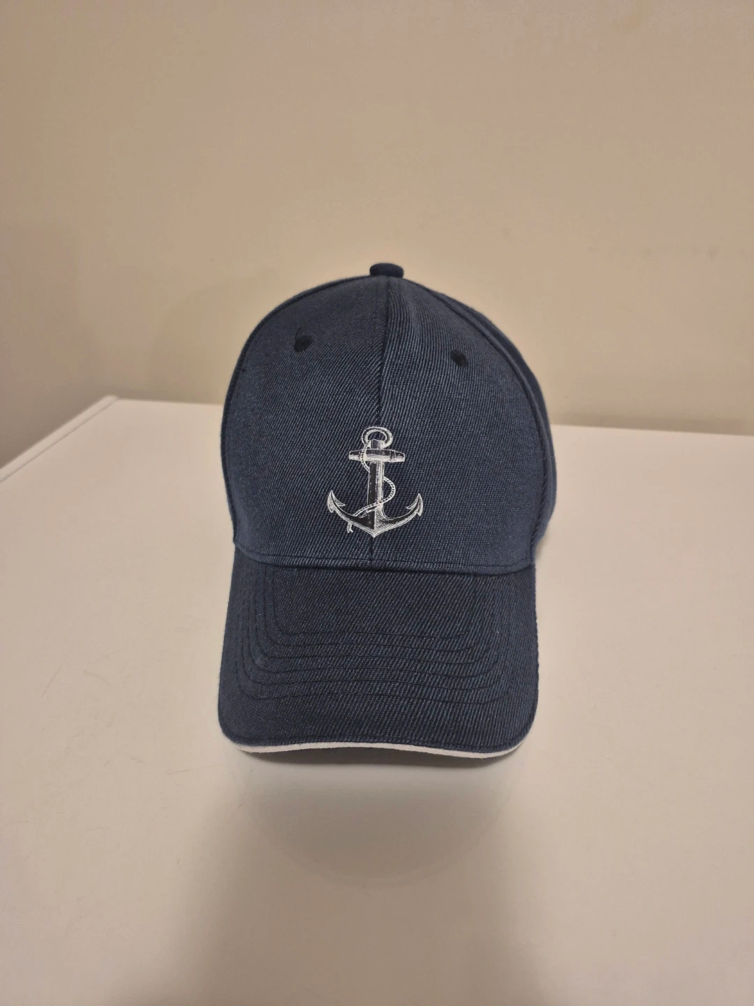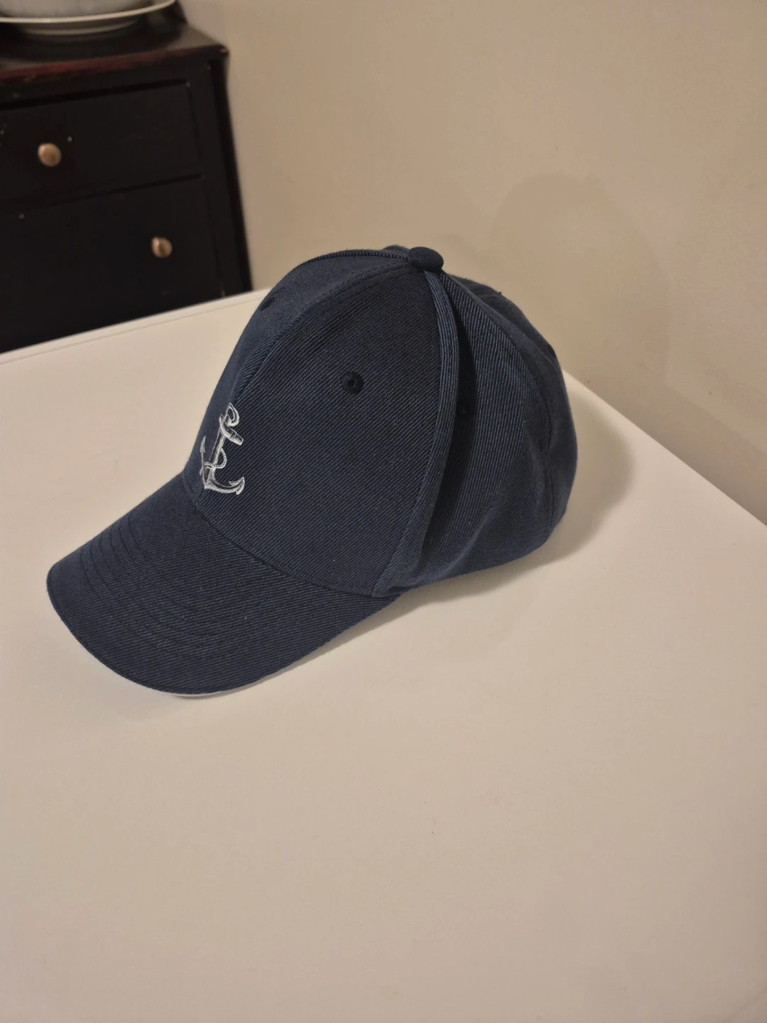 This navy blue baseball cap features a stylish white anchor embroidered on the front. It's made from a durable fabric with an adjustable strap for a comfortable fit. It's great for casual wear or a day out in the sun!