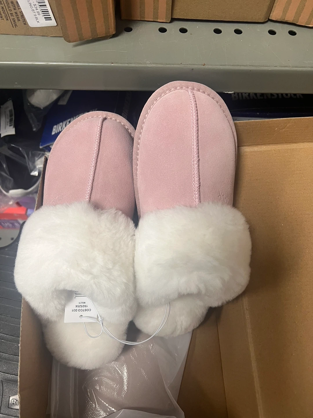 Cozy shearling lined slippers with a soft suede outer. They're perfect for keeping your feet warm around the house. Available in tan or pink.