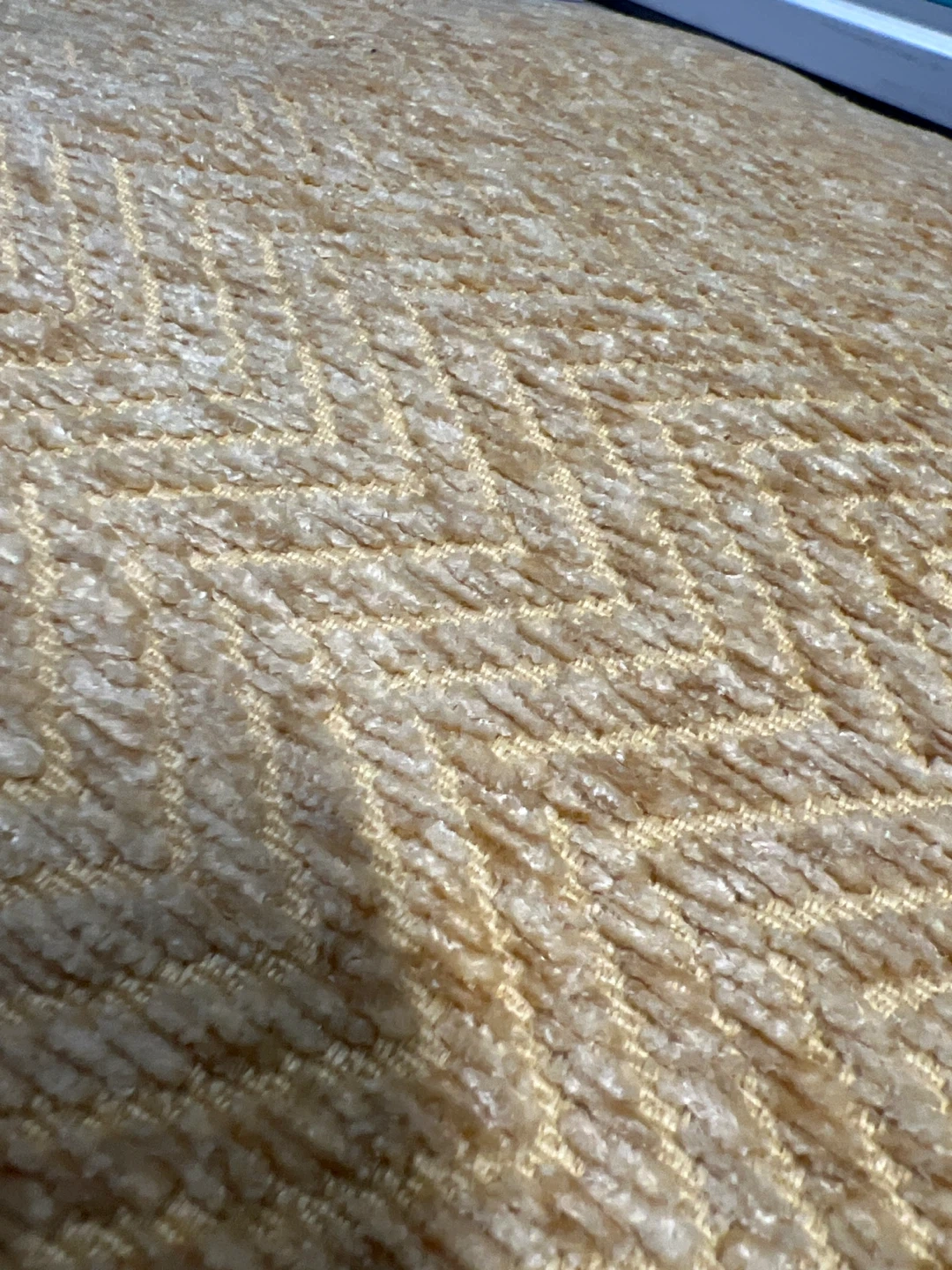 A shimmering classic from the early 2010s Pier 1 collection. This is the original high-quality chenille—not the new stuff. It features a plush herringbone texture woven with metallic gold thread that catches the light.