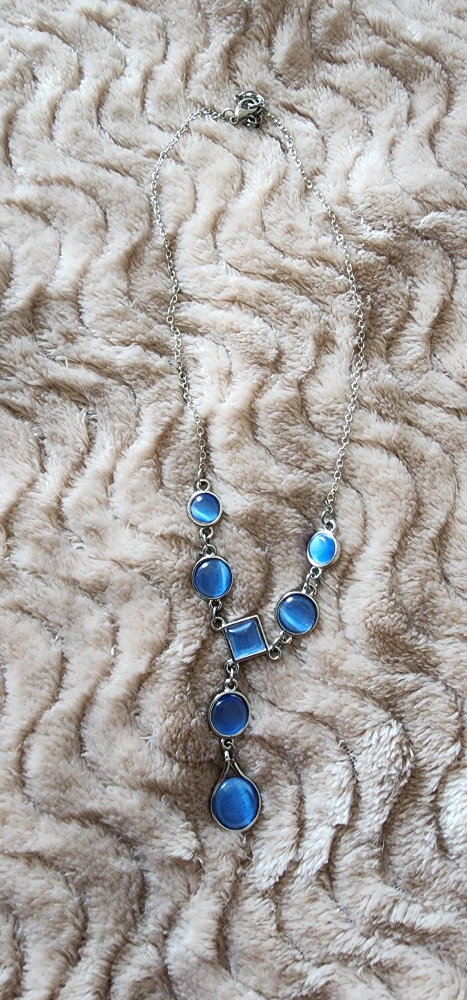 Silver chain necklace with blue stones. The necklace features a drop with a square stone in the centre, followed by three round stones. There are then two stones at the top of the necklace. The necklace is 18 inches long.