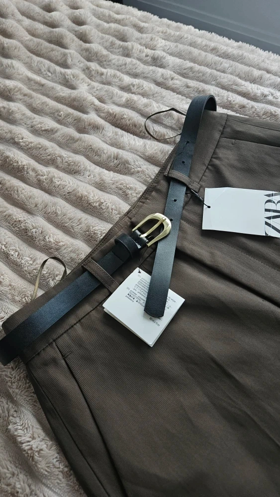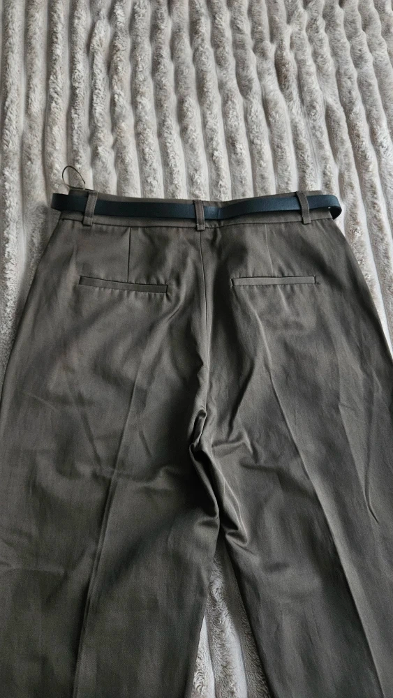 Selling a pair of Zara trousers in olive green. They are a size XS and come with a belt. Great for a casual or dressed-up look!