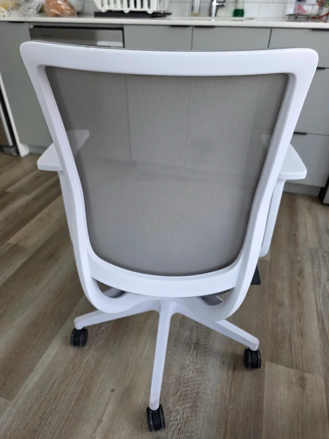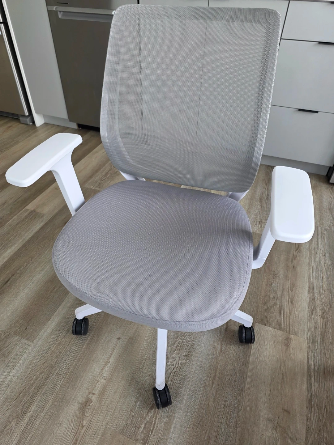 This Staples Essentials Ergonomic Fabric Swivel Task Chair is grey. It features a mesh back and fabric seat for comfort. The chair has adjustable armrests and a swivel base with wheels for easy mobility. This chair is suitable for home offices or work environments.