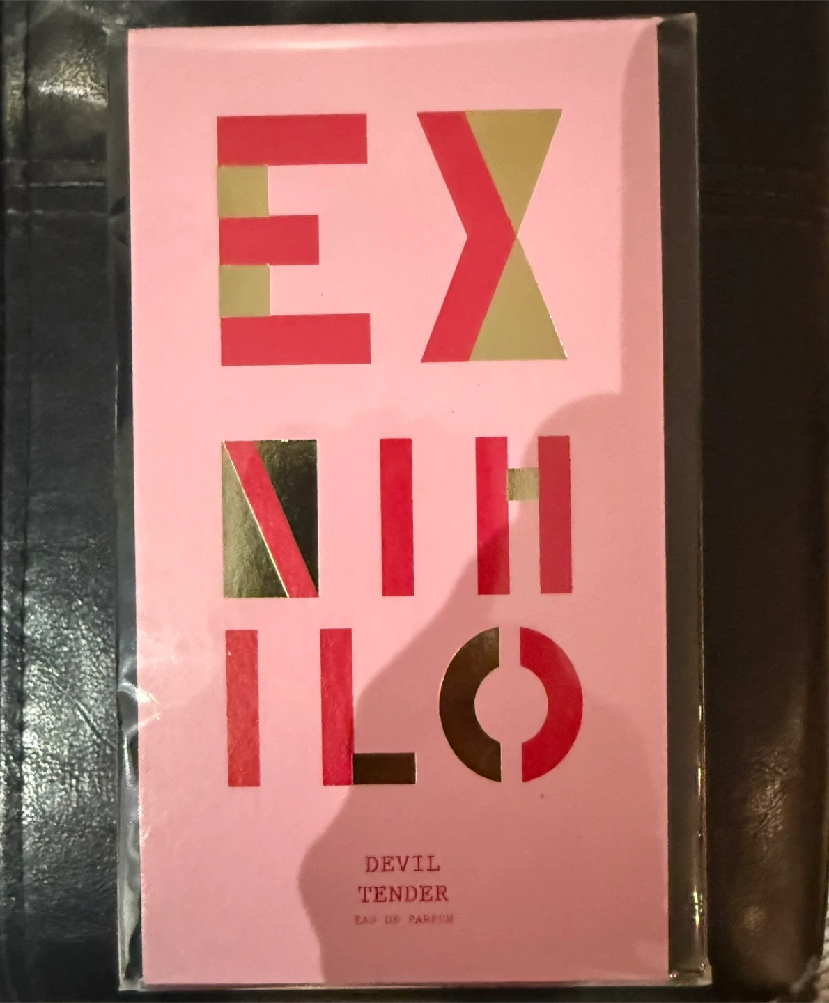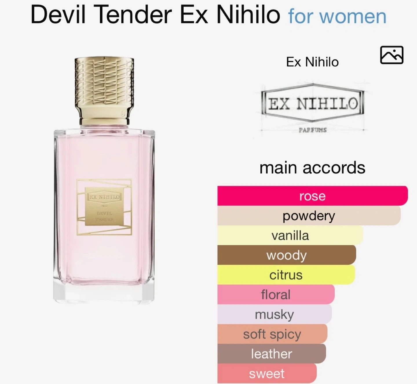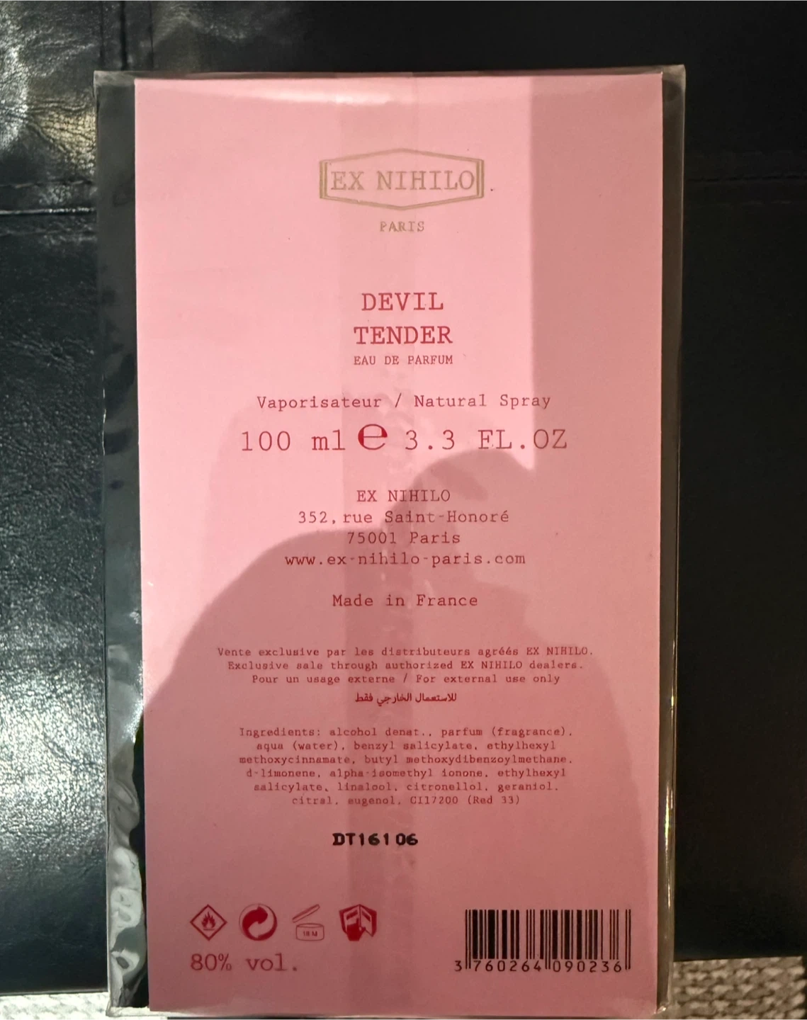 Selling a 100ml bottle of Ex Nihilo's Devil Tender Eau de Parfum. It's a natural spray with main accords of rose, powdery, and vanilla. The bottle is 3.3 FL.OZ and comes in its original box. Made in France!