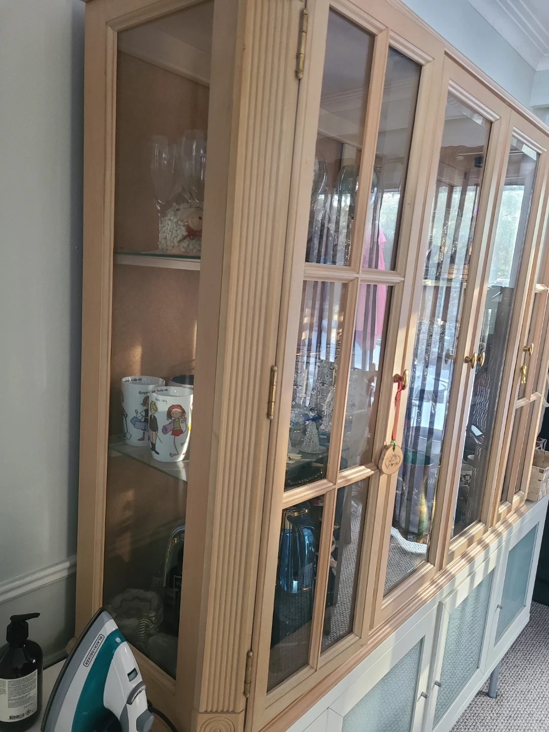 A lovely display cabinet with multiple glass doors and shelving. It's made of light-coloured wood and features decorative detailing on the frame. Great for showcasing collectibles, dishes, or books!