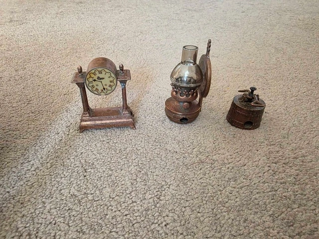 Three detailed miniature pencil sharpeners included: a Mantel/Grandfather Clock with a swinging pendulum and vintage clock face, a Hurricane/Oil Lamp with a clear glass chimney and ornate base, and a Coffee/Grain Grinder with a rotating hand crank. Made of heavy-duty die-cast metal with an antiqued copper/bronze finish. Each has a functional pencil sharpener. Good vintage condition with natural aged patina. The clock face shows some light age-related wear.