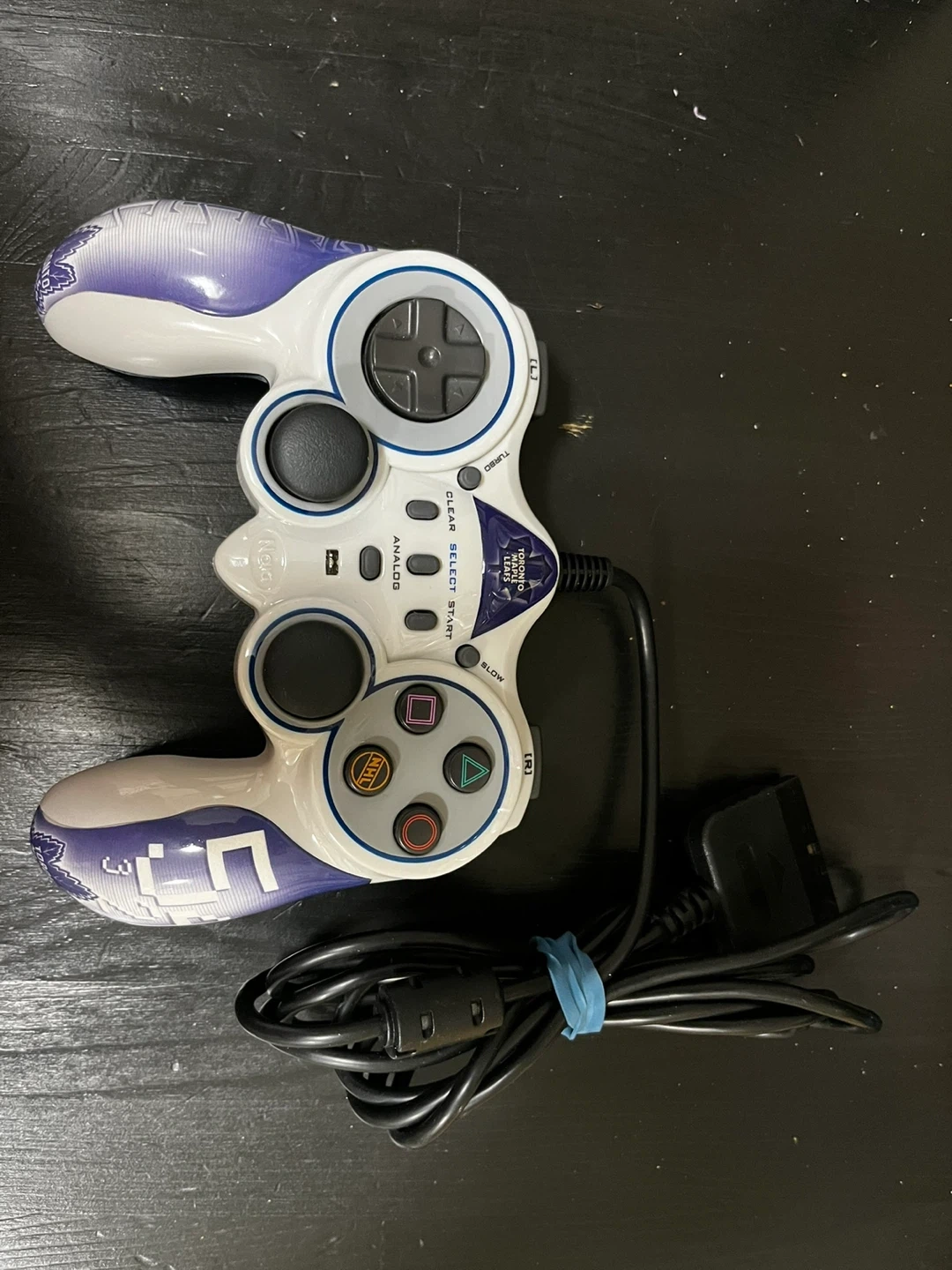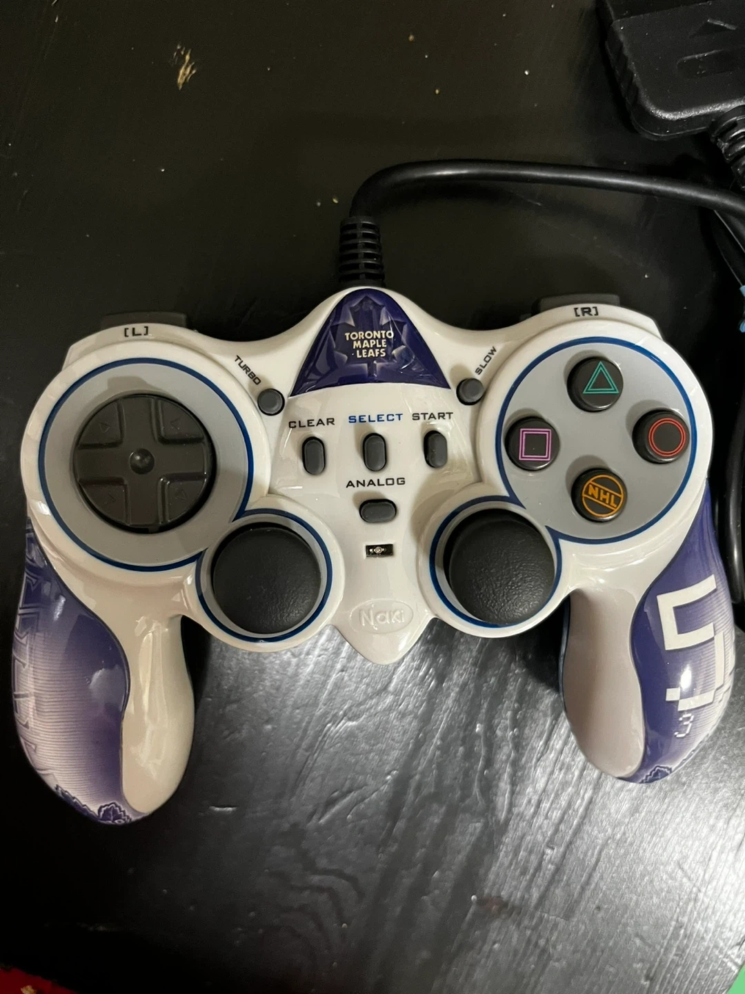 This item is a collectible Naki NHL Toronto Maple Leafs Wired Analog Controller designed for the Sony PlayStation 2.