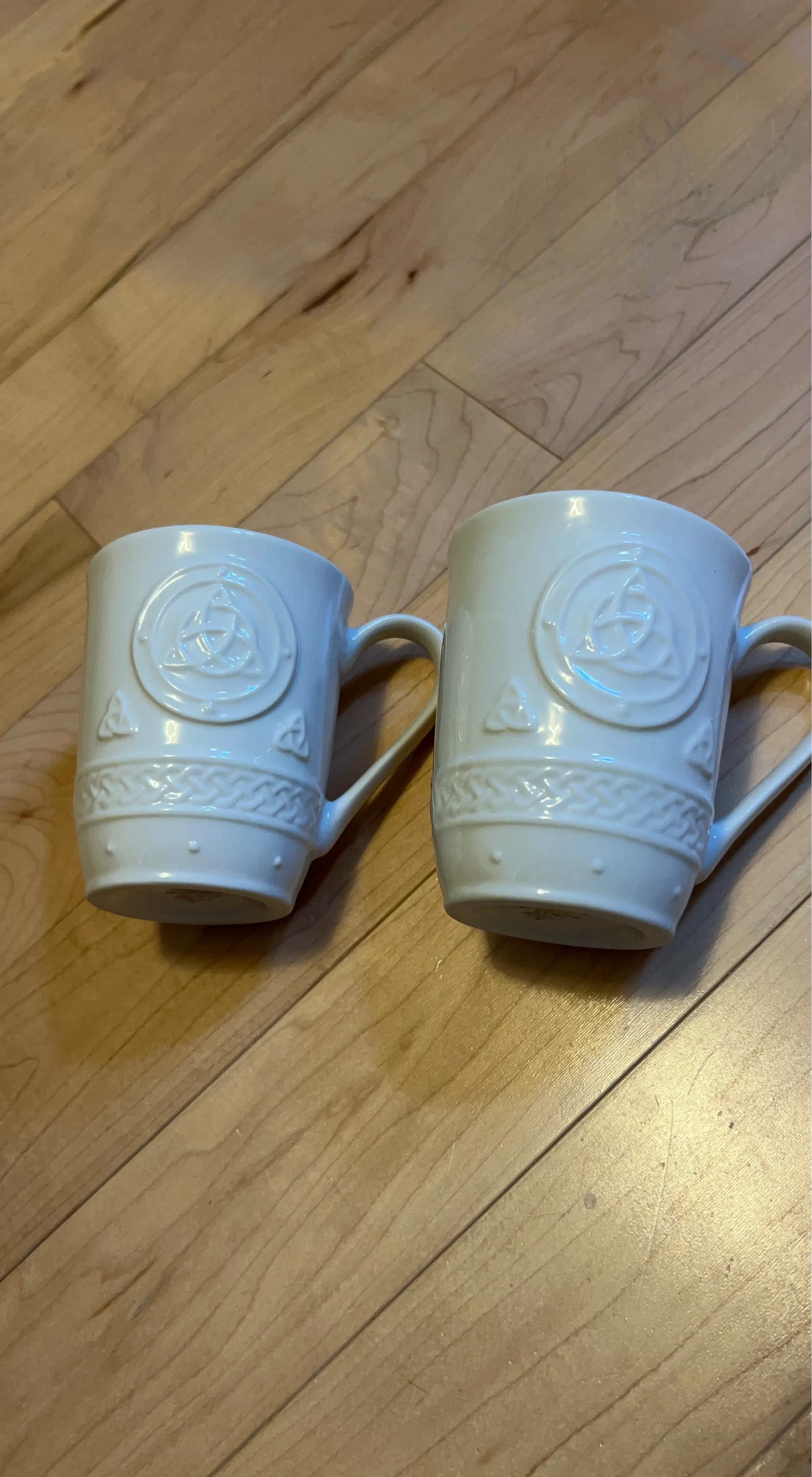 These white ceramic mugs feature embossed Celtic knot designs and braided patterns. They're perfect for enjoying your morning coffee or tea. A great set for anyone who loves Celtic heritage!
