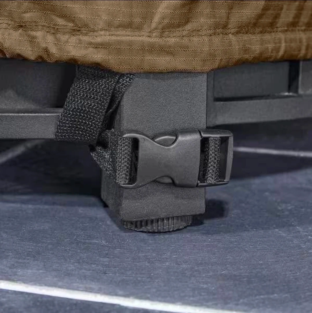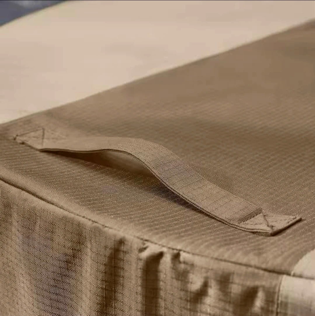 This Hampton Bay universal round fire pit cover is made from durable fabric. It features built-in buckles for a secure fit. It also includes padded handles for easy removal.