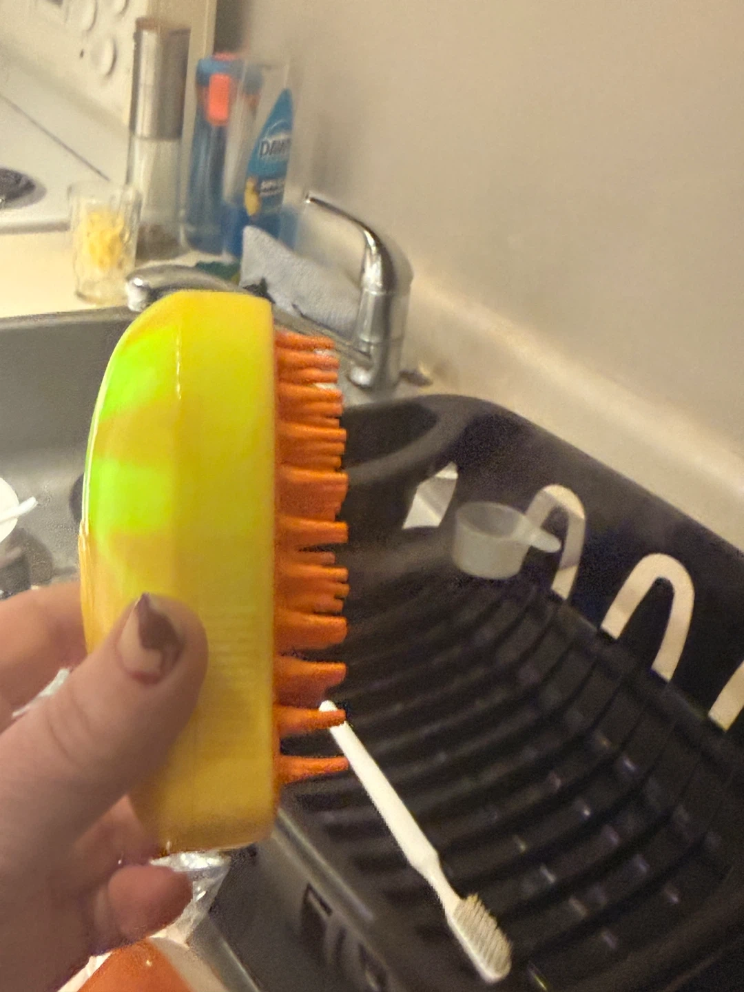 This is a pet brush for grooming. It has a green handle and orange bristles. It's designed for easy filling and effective pet grooming for cats or dogs with long hair. It lights up and sprays a cool mist while brushing with one click. comes with charge cord