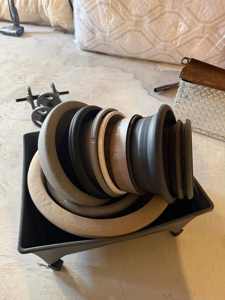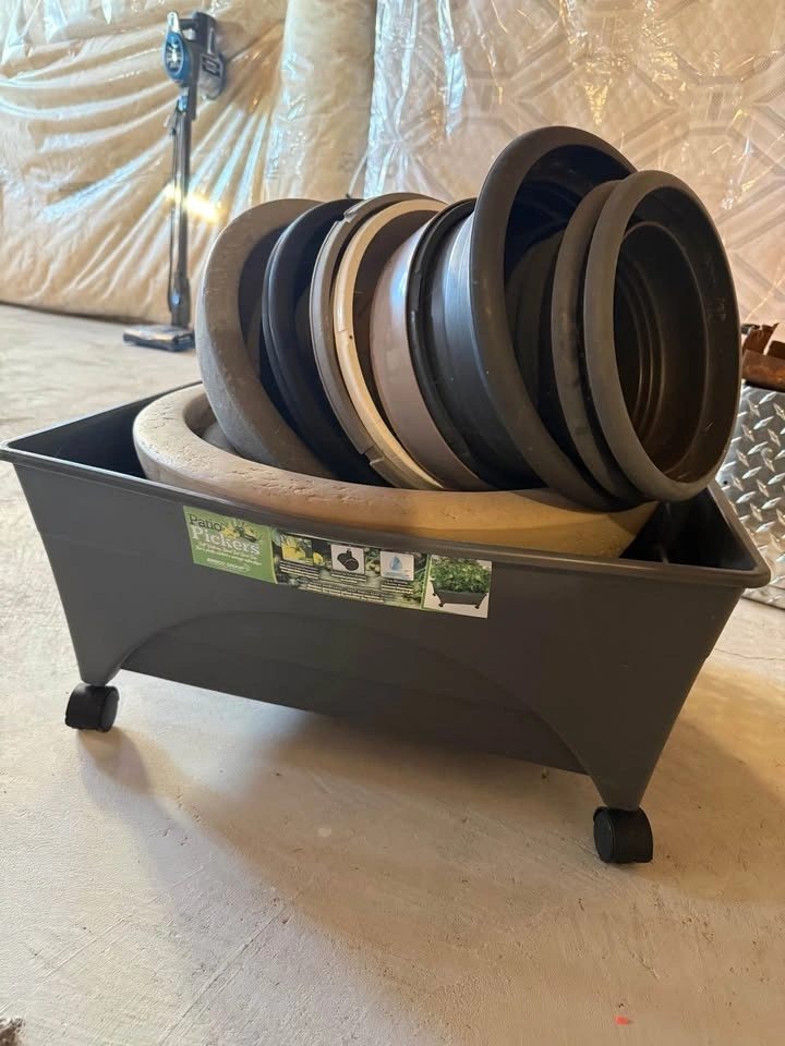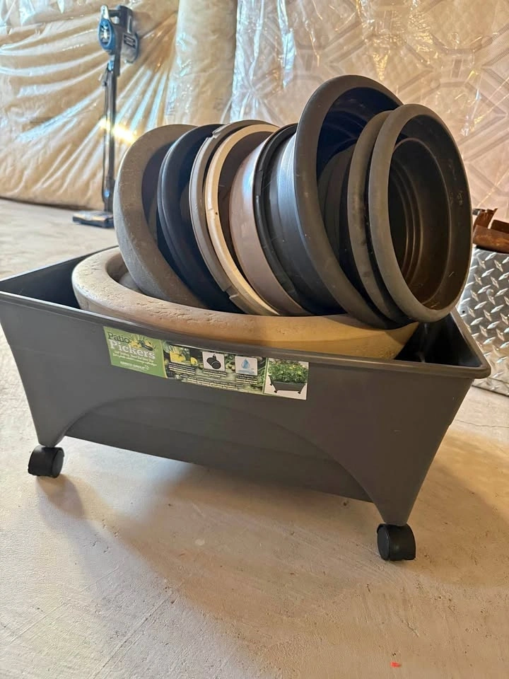 10+ Assorted Planting Pots: A mix of durable resin, plastic, and decorative styles in various sizes (approx. 6" to 12" diameters).
