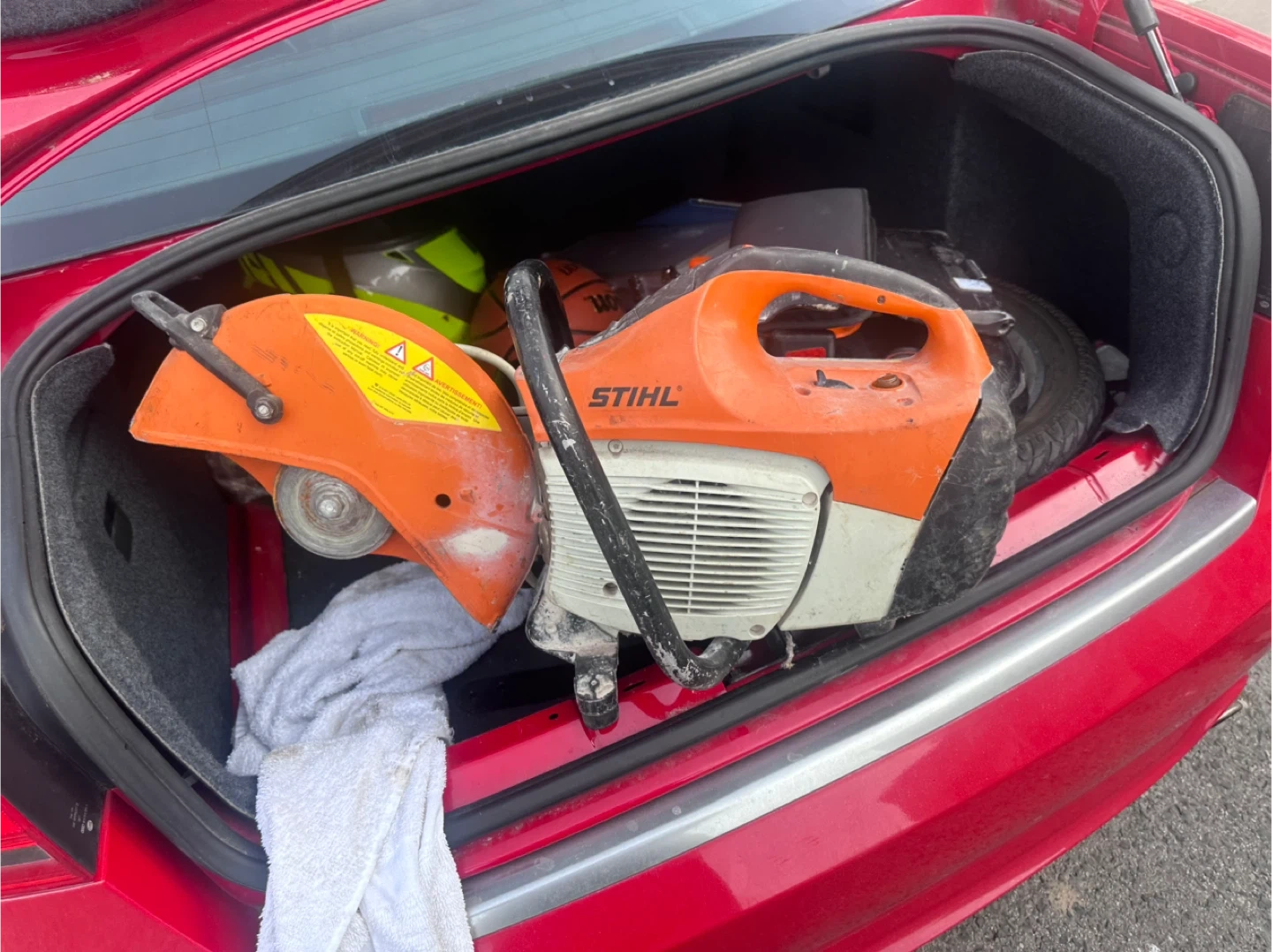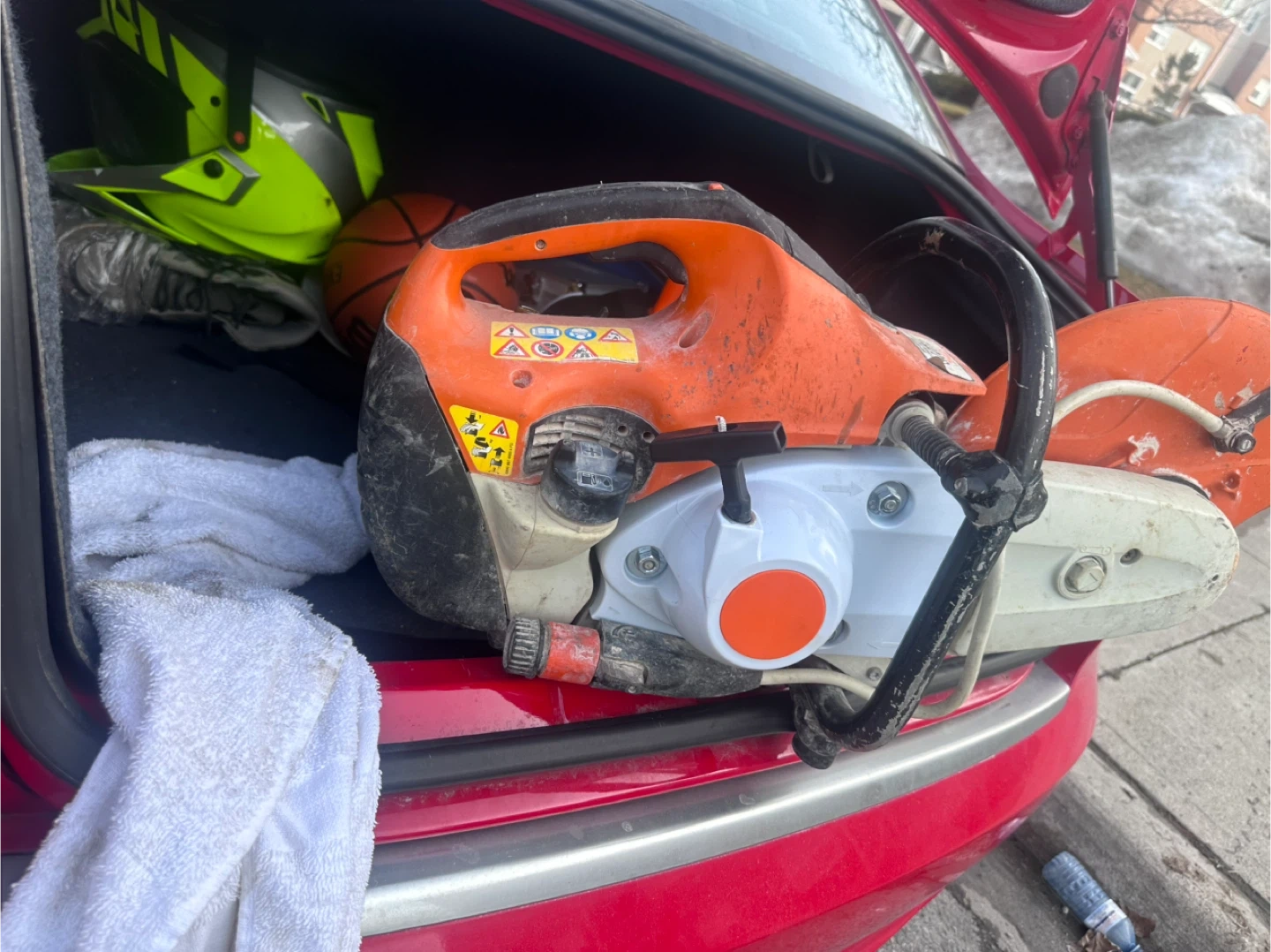 Orange and black Stihl cut-off saw not working. This saw is designed for heavy-duty cutting tasks. It's powered by a gasoline engine for portable operation.