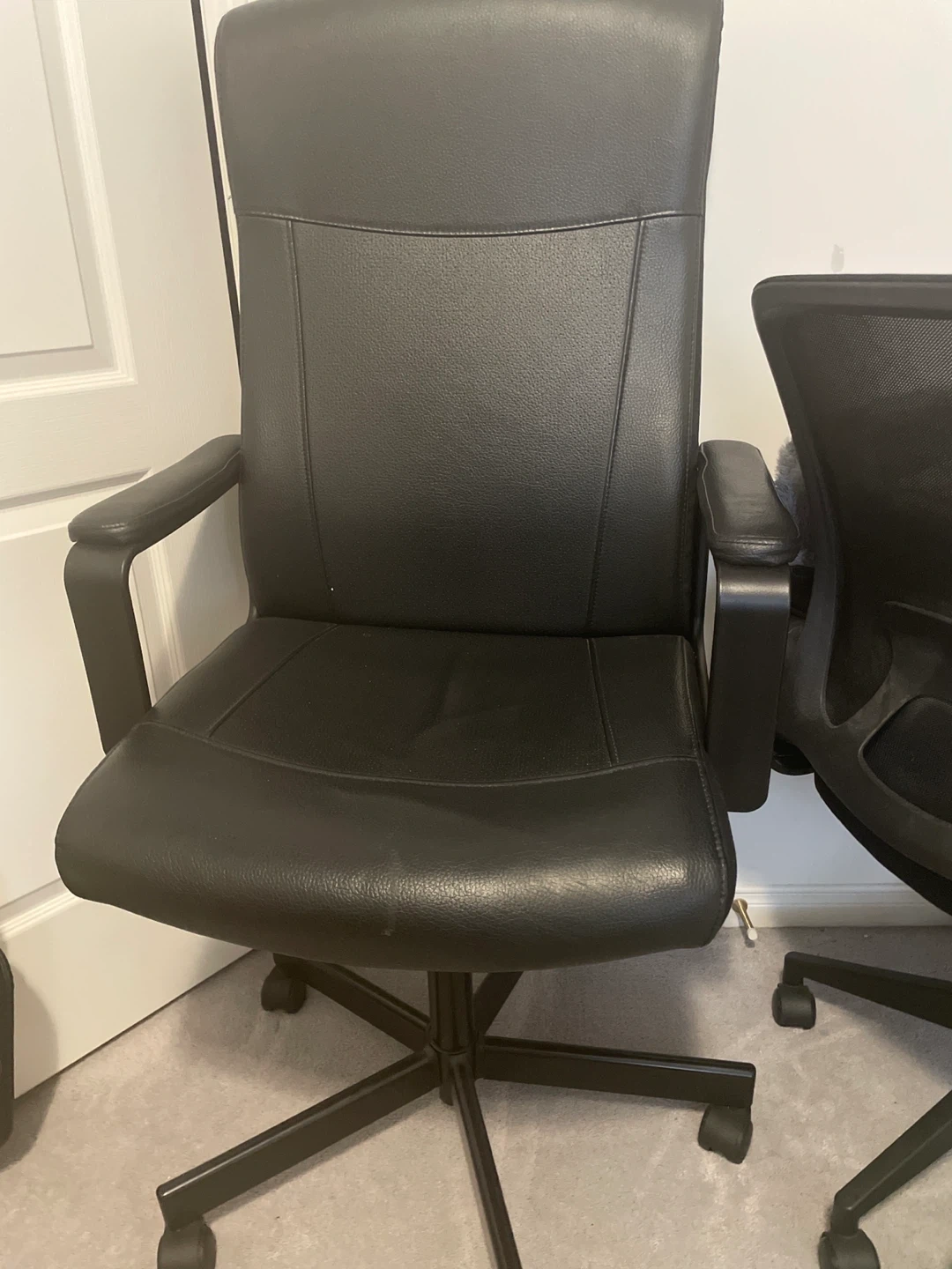 This is a black faux leather office chair. It features a padded seat and backrest for comfort. The chair has rolling casters for easy mobility. It's suitable for any home office or workspace!