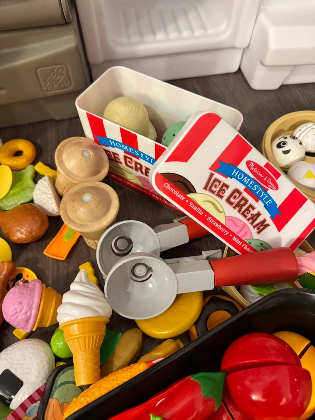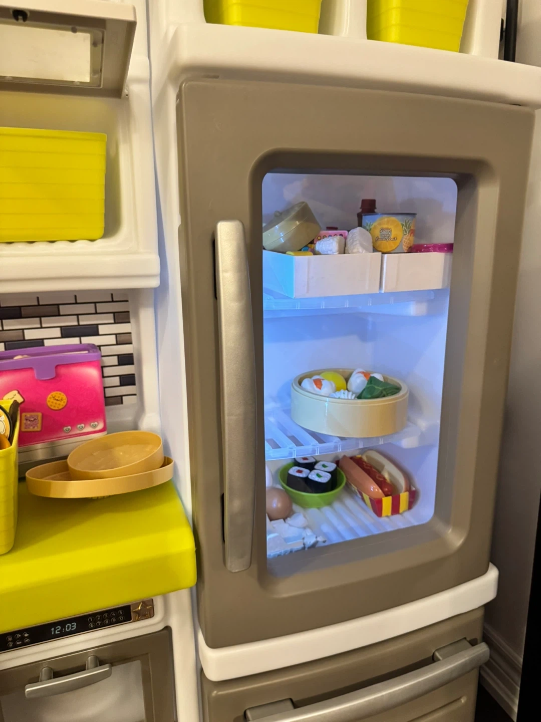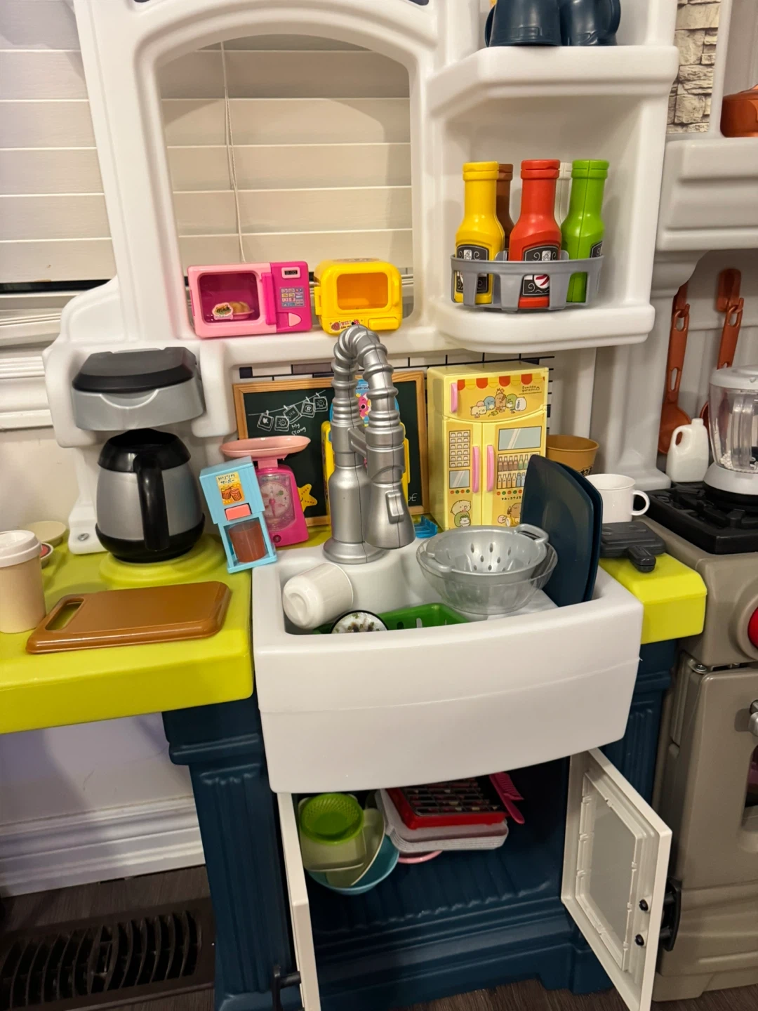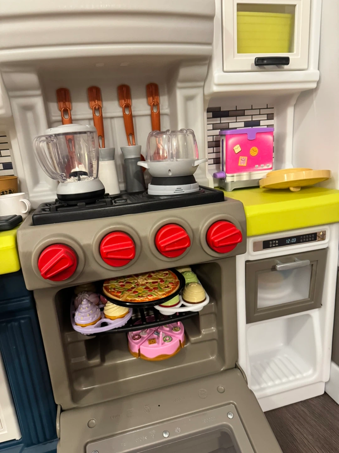 Step2 play kitchen set fridge with light and cooking sounds. with tons of extra bought accessories including food, pots, pans, blender, toaster, and fridge items. It even comes with a cute apron for your little chef! This kitchen encourages imaginative play and culinary fun.