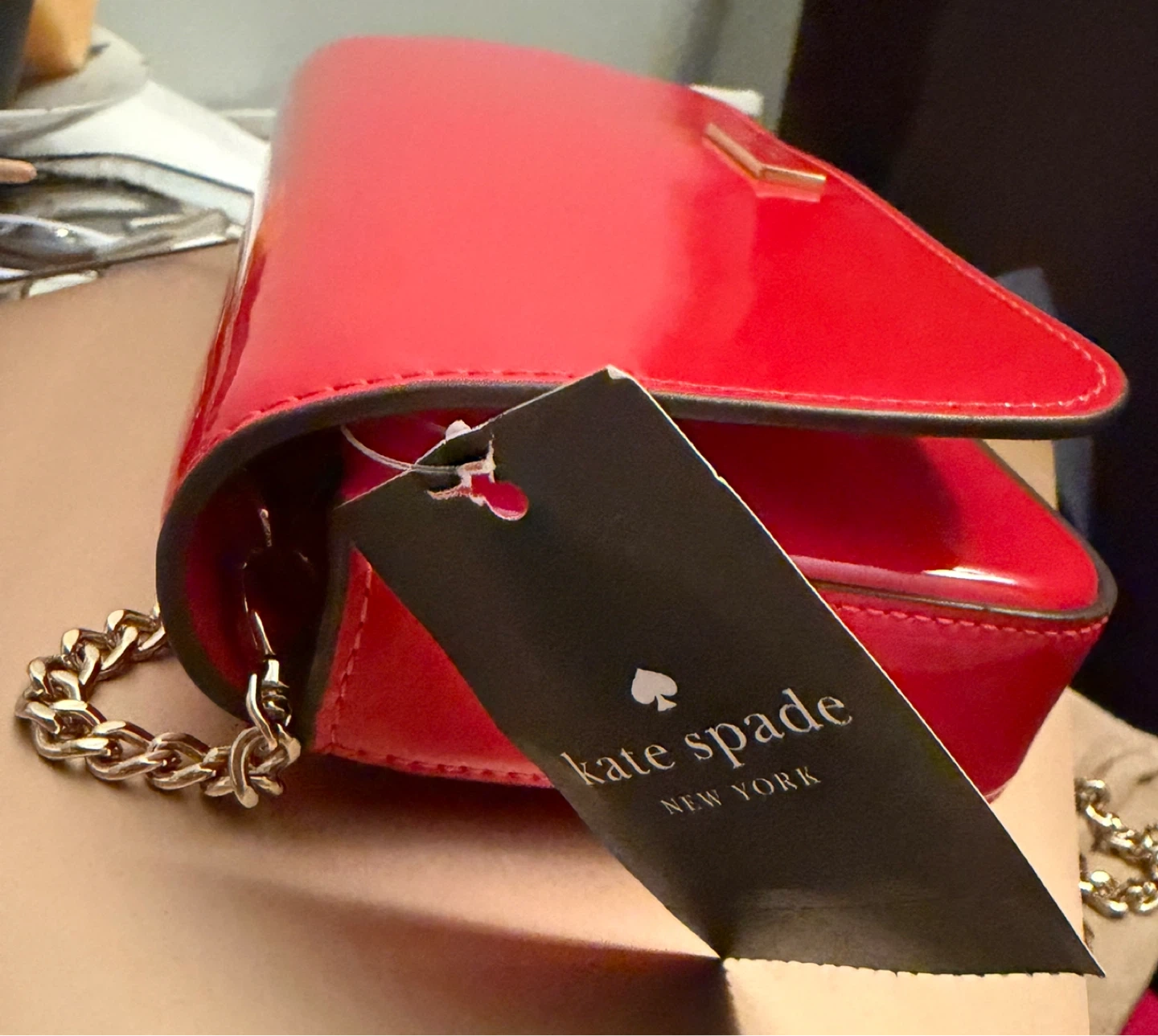Bright red Kate Spade wallet with a shiny patent leather finish. It features a classic flap closure and a gold chain strap for shoulder or crossbody wear. This stylish accessory is perfect for a night out or for adding a pop of colour to any outfit!