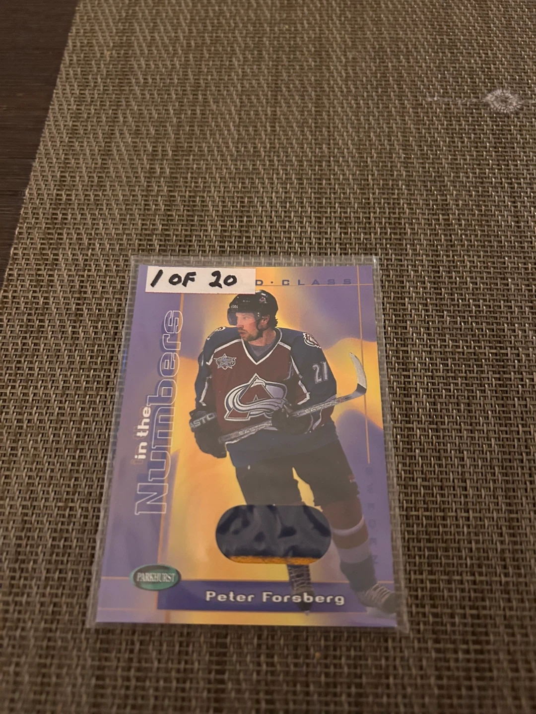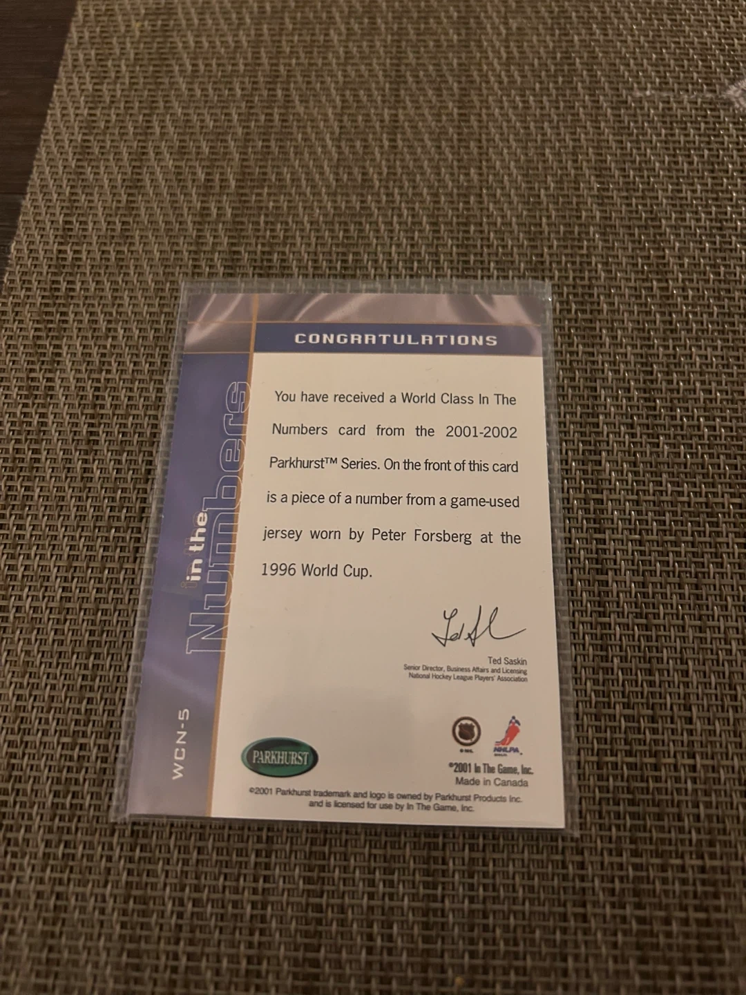 You've received a World Class In The Numbers card from the 2001-2002 Parkhurst Series. The front of this card is a piece of a number from a game-used jersey worn by Peter Forsberg at the 1996 World Cup. This item is a collector's piece for hockey fans.