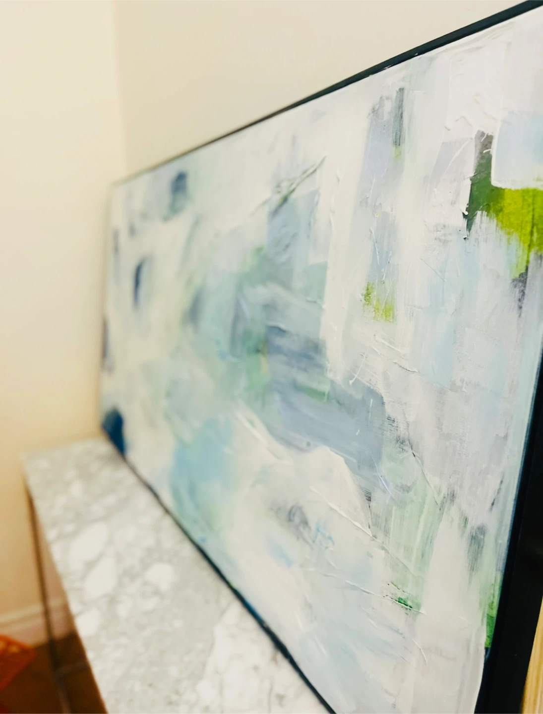 Beautiful original abstract painting with a textured finish. Features a blend of white, blue, and green tones with touches of dark blue and lime green. It's framed in a modern black wood floater frame.