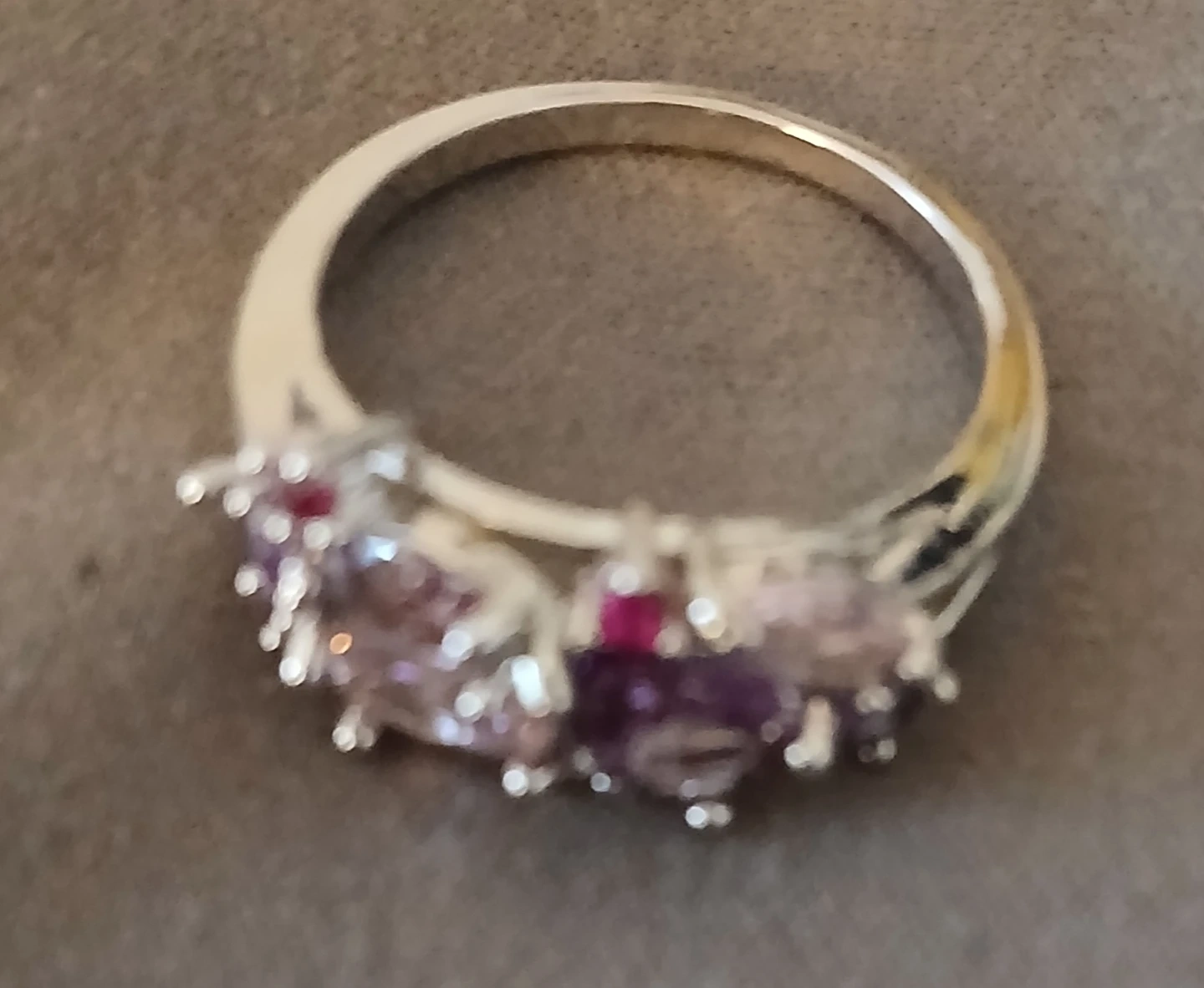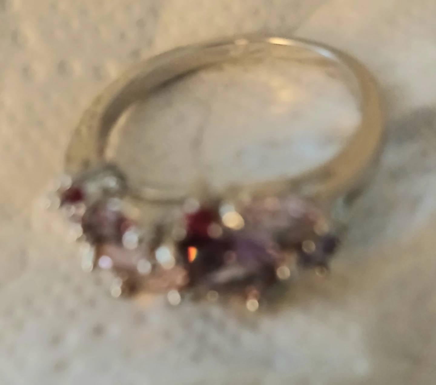 Pink beaded bracelet with gold accents and a silver-tone ring featuring purple and pink stones. This set adds a touch of sparkle to any outfit! A lovely accessory for yourself or as a gift.