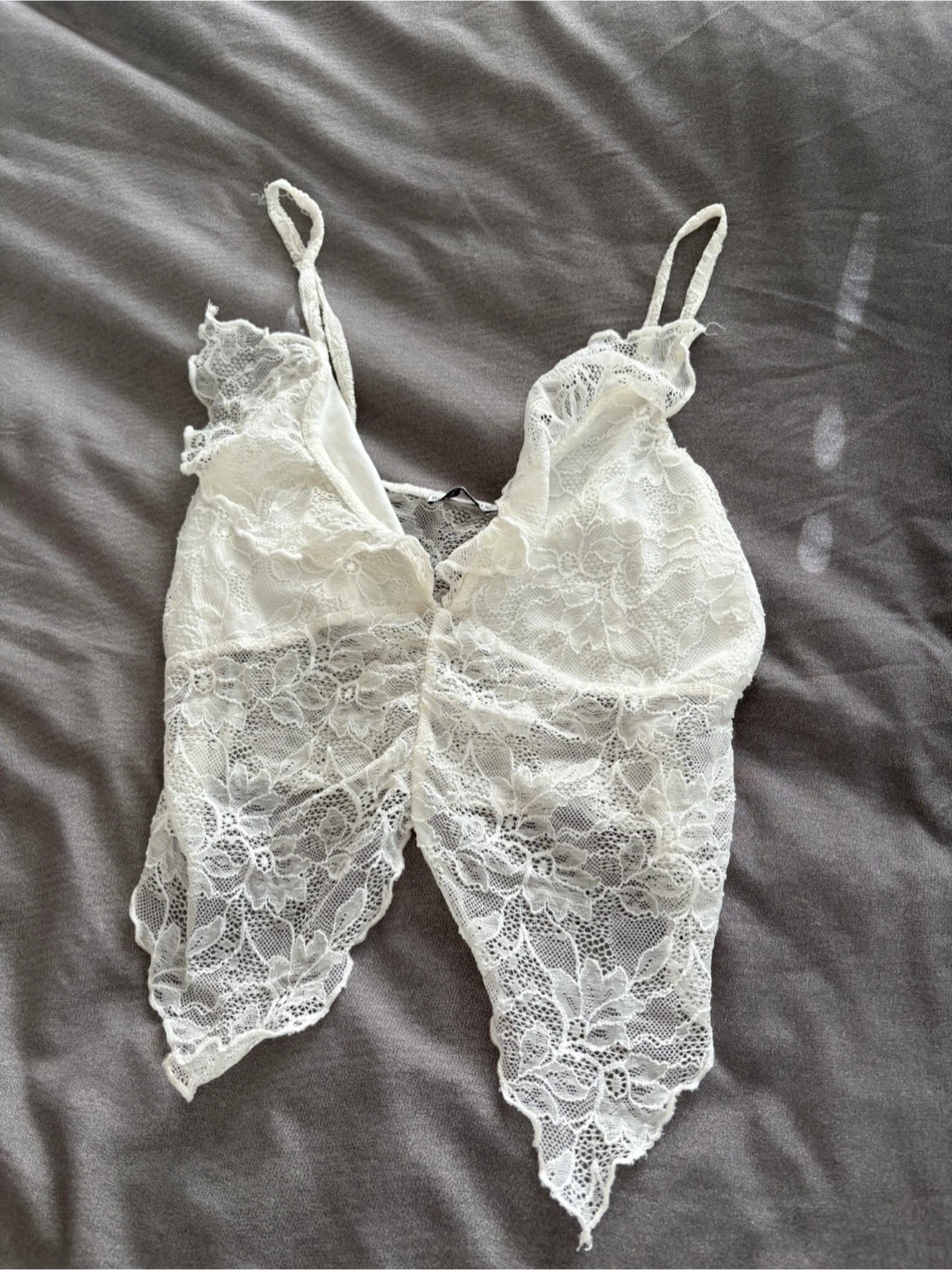 White lace crop top with adjustable straps. Lace overlay with a satin lining. Size S, made in Albania.