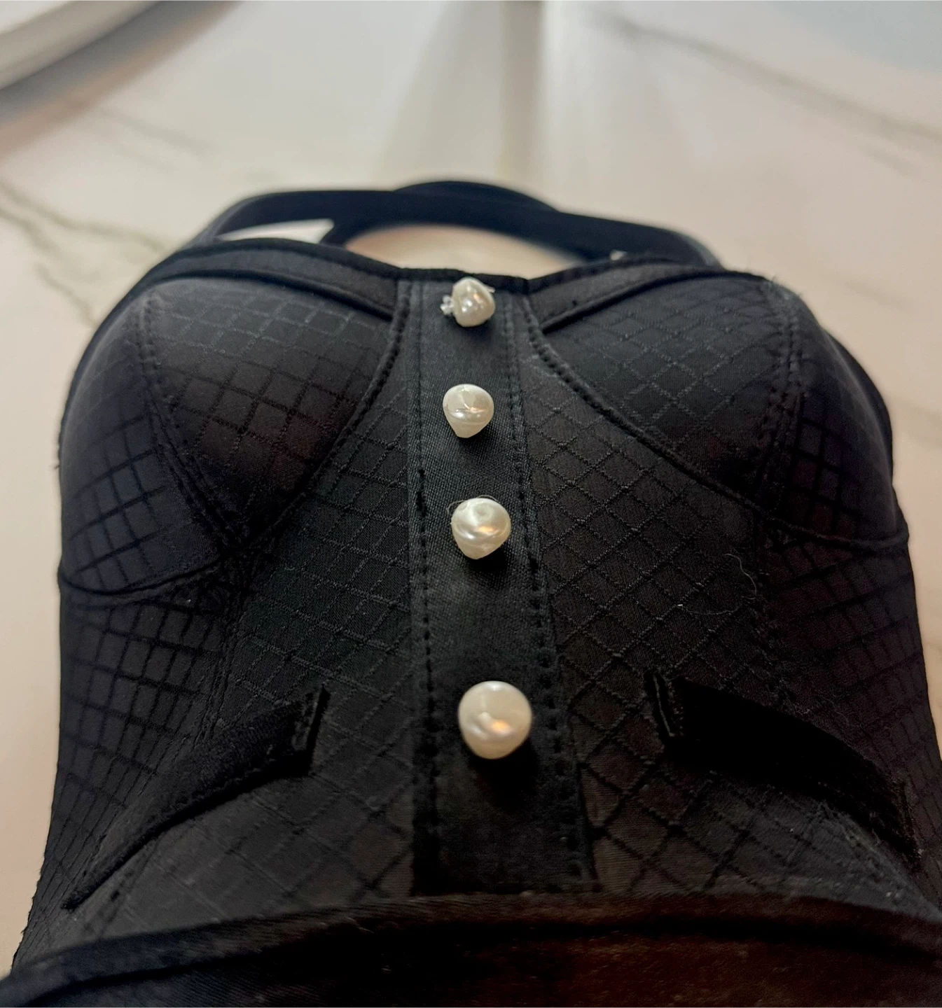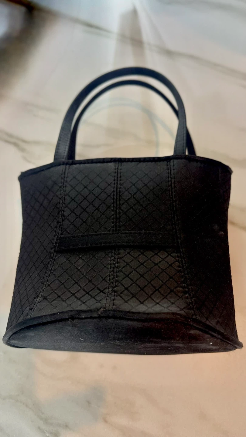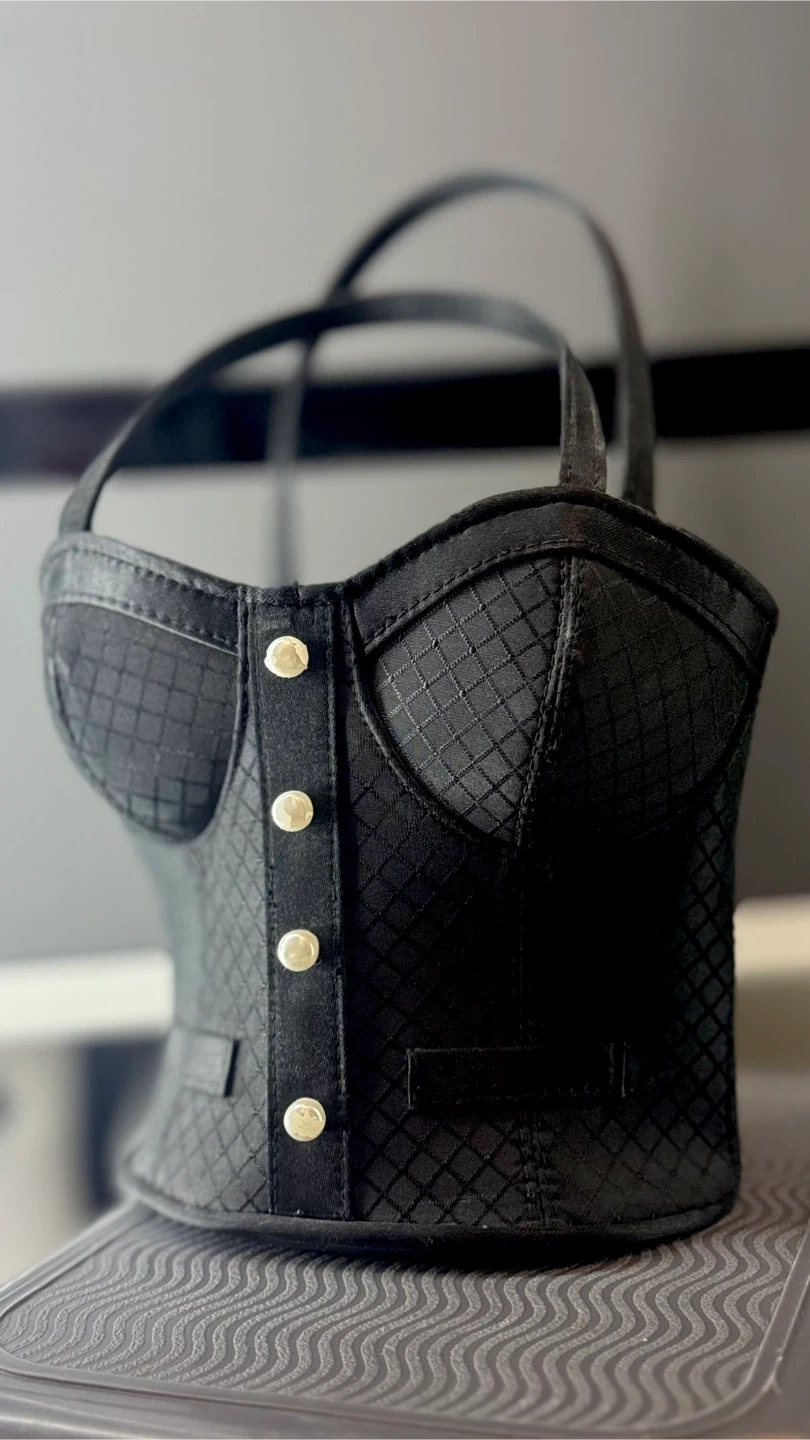 This is a unique black handbag shaped like a corset! It has a quilted pattern and button details on the front. It's in great condition and ready for a new home!