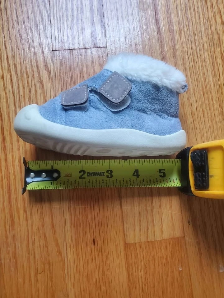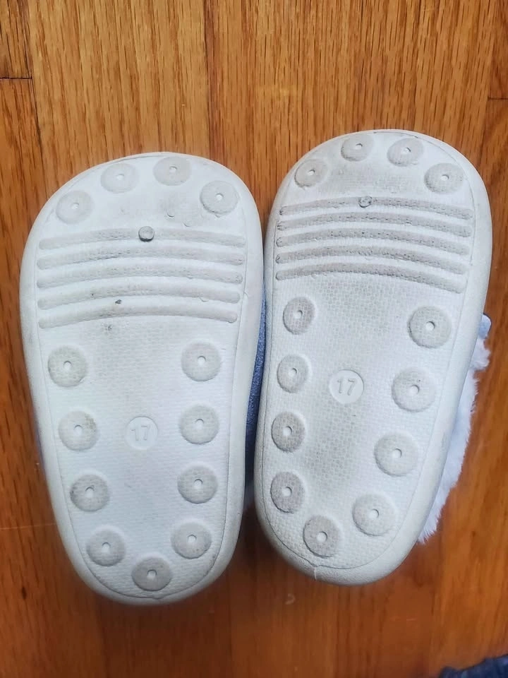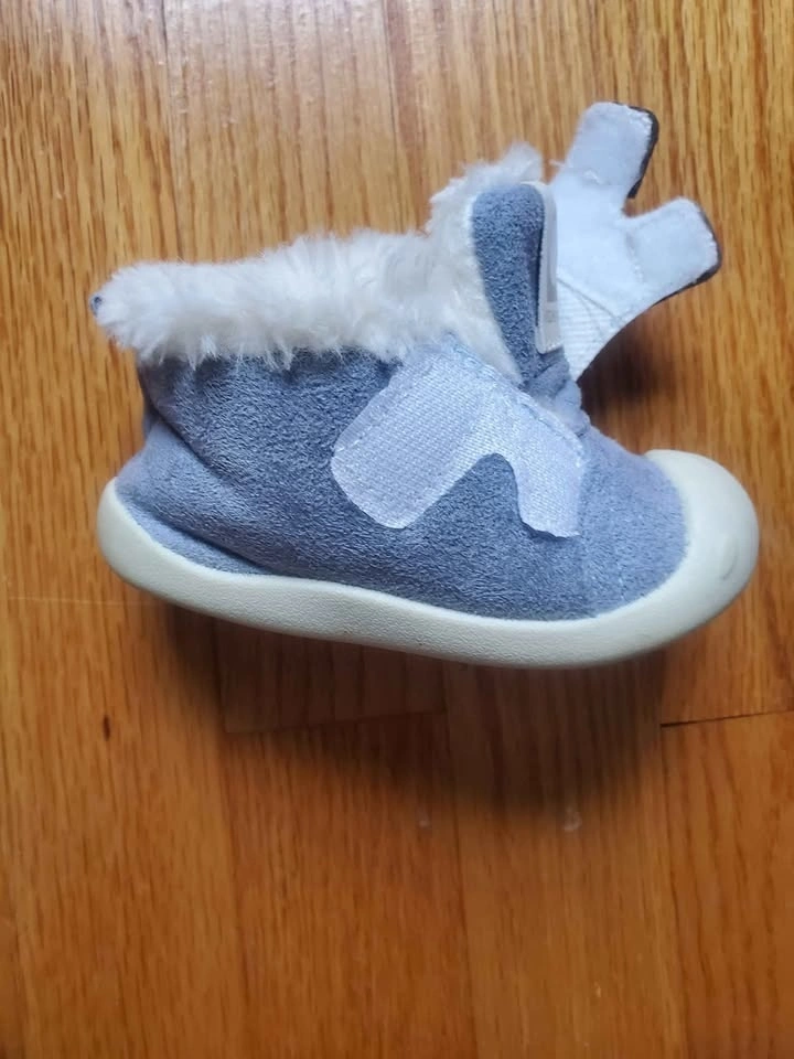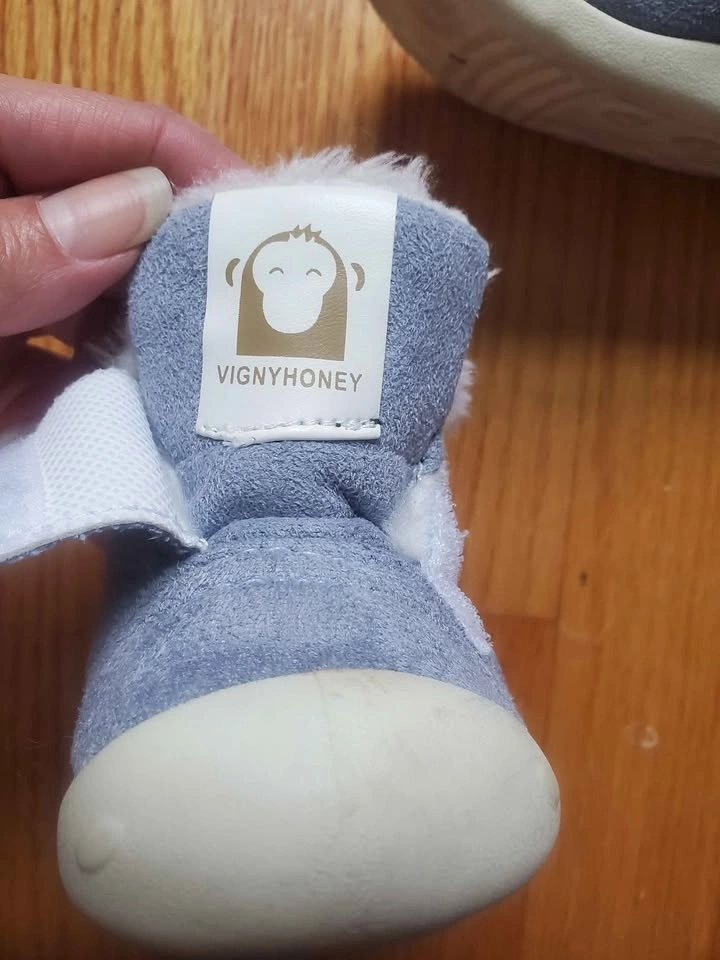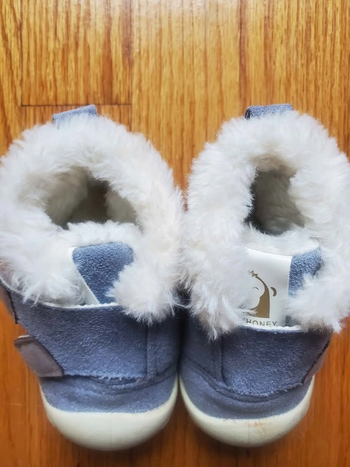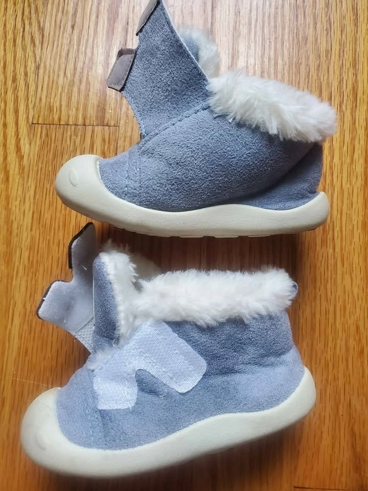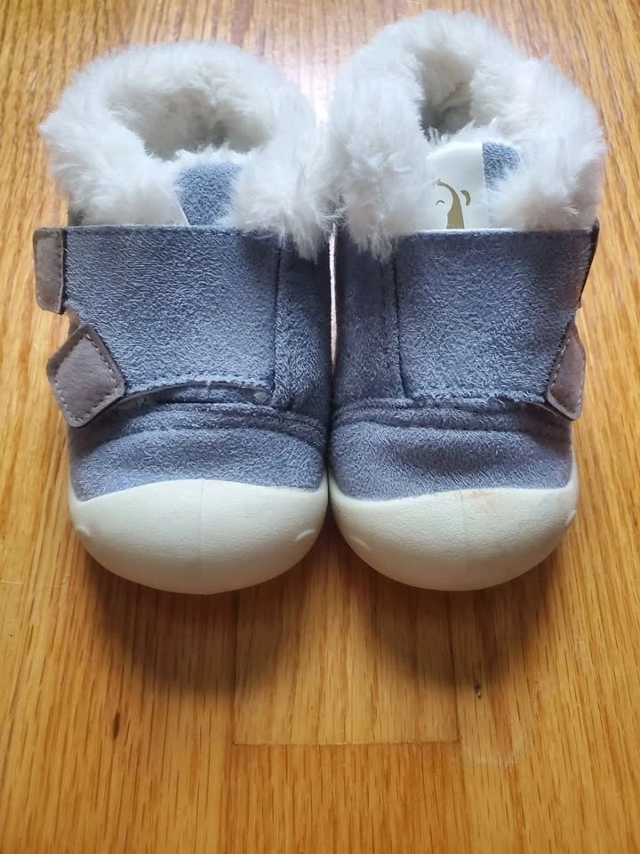 These cozy Vigny Honey baby shoes are perfect for winter. They are gray and white with a faux fur lining and are a size 17, fitting babies approximately 6-12 months old.