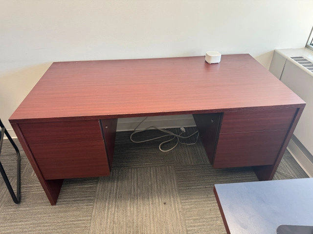 Selling a great-looking, sturdy desk with a classic mahogany wood grain laminate finish. Perfect for a home office, student, or professional. It offers plenty of workspace and is built to last. Key Features: Finish: Rich mahogany wood grain laminate (easy to clean and scratch-resistant). Storage: Includes 4 spacious drawers, including a file drawer. Security: Features locking drawers to keep your documents and supplies secure. Condition: Excellent used condition. Minimal wear (mention any specific minor scratches/nicks if applicable). Style: Clean, professional, and executive style. Dimensions (Approximate): 5ft x 30in x 29in (Please measure your space before contacting!) Other Details: Comes from a smoke-free and pet-free office. Note: This is a solid piece and will require two people for pickup/moving. Price: $75 Location: Downtown Calgary Pickup: Must be picked up by the buyer. Please contact me if you are seriously interested or have any questions. Thanks! For Sale By: Owner