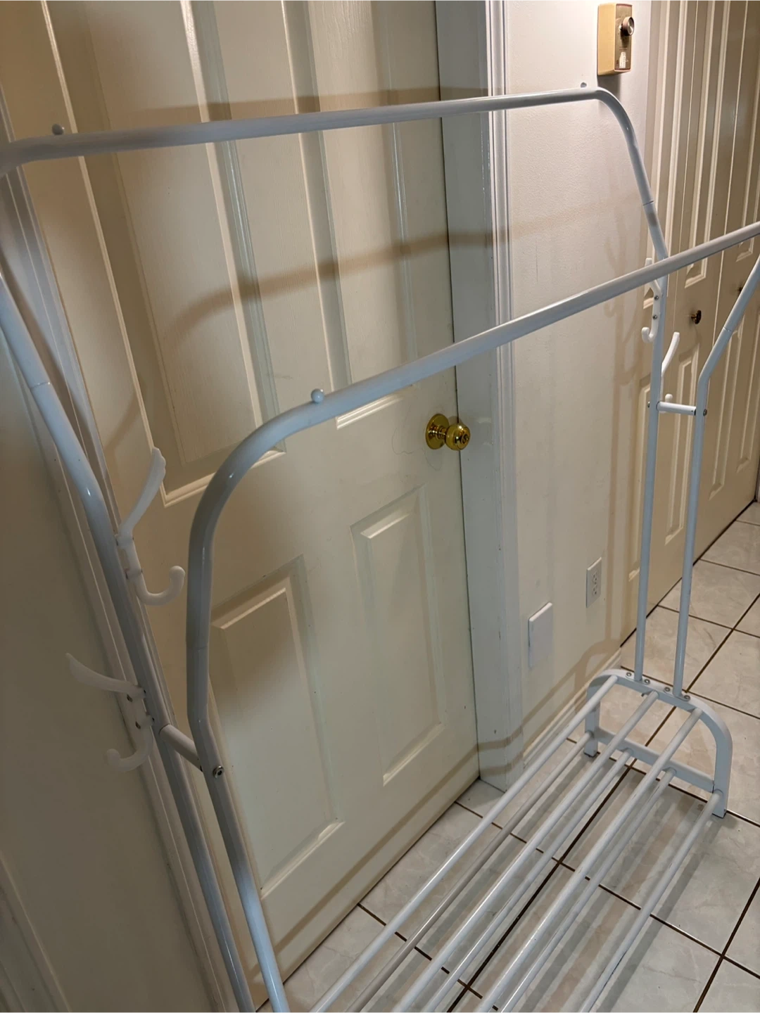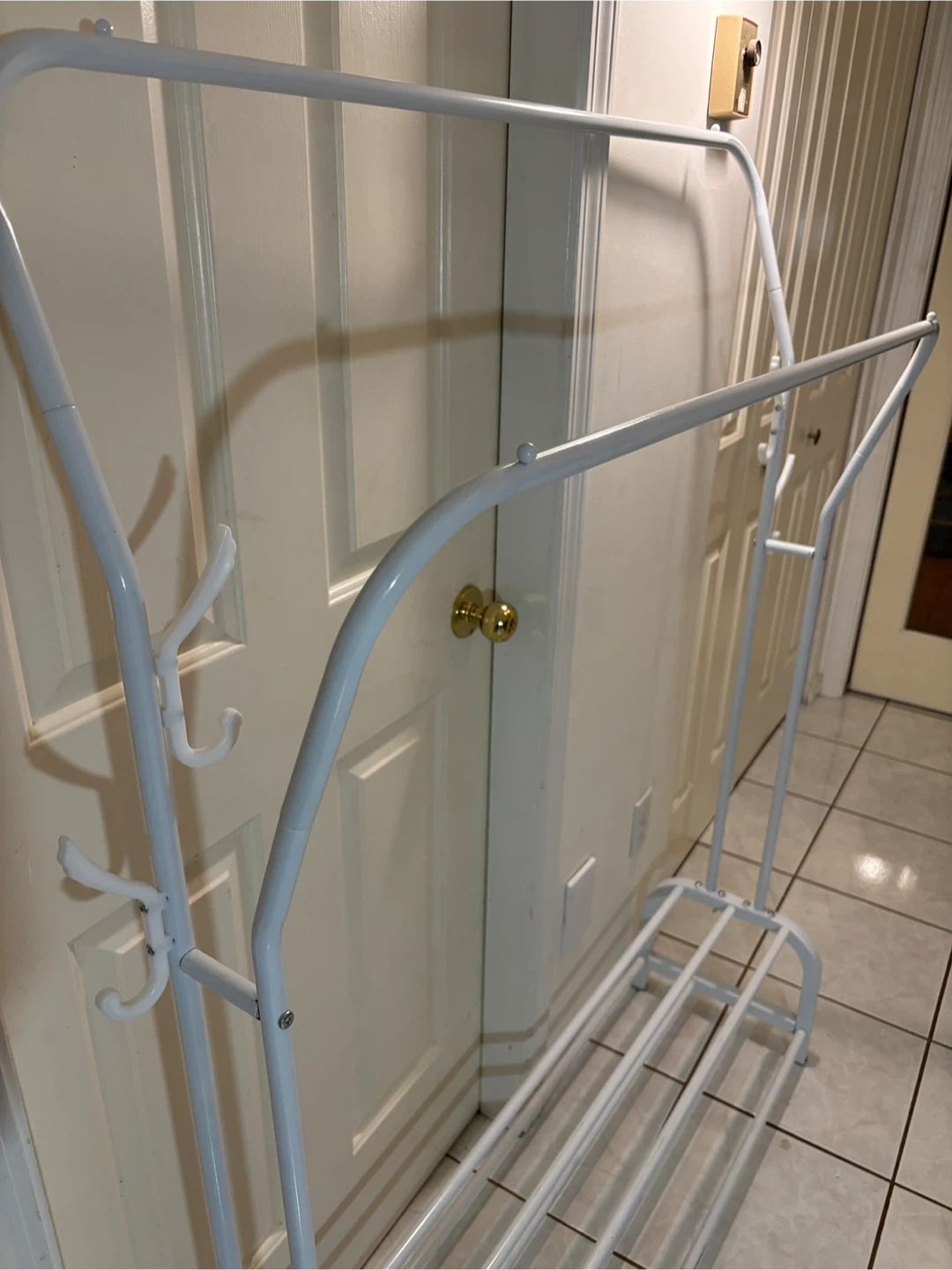 Lightweight double-rod clothes rack offering practical hanging and storage space. Features two hanging rods at different heights, plus extra hooks on the end and inside for bags, hats, or accessories. Includes a bottom shoe rack - great for bedrooms, entryway or closets.