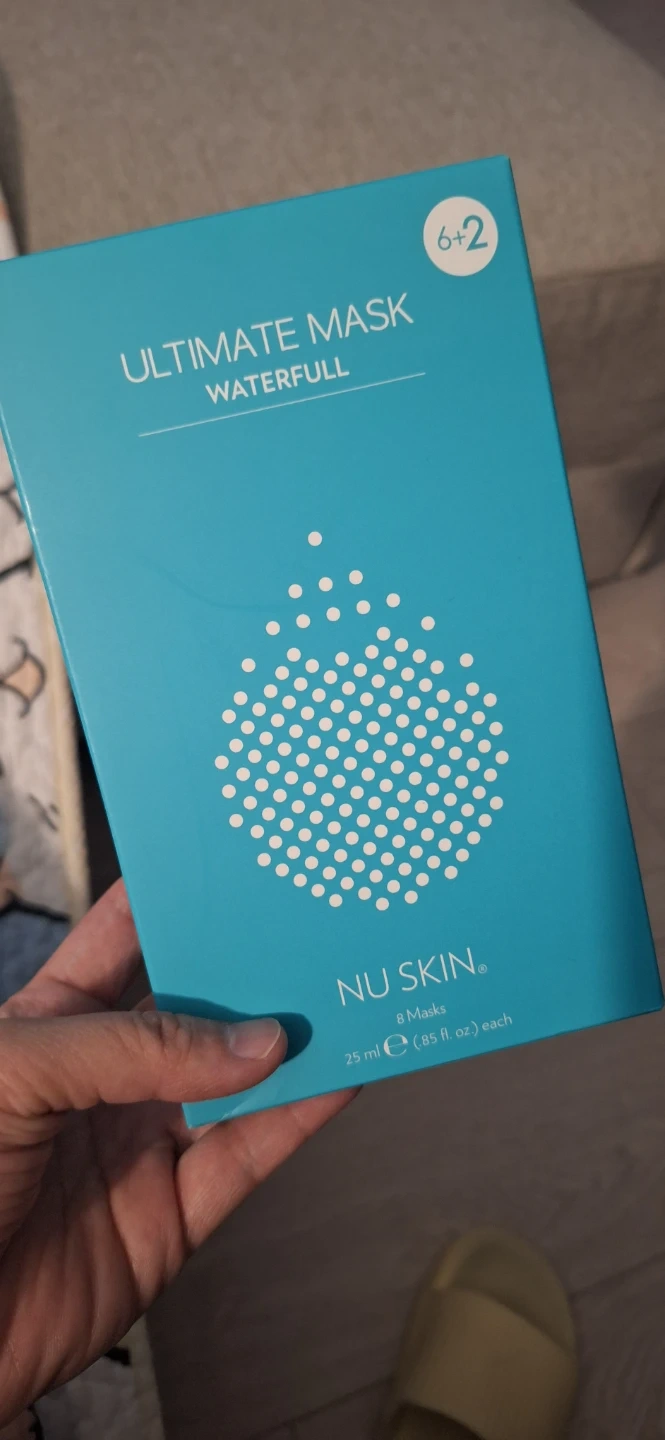 This box contains 8 NU SKIN Ultimate Mask Waterfull sheet masks. Each mask is 25 ml (0.85 fl. oz.). They expire in October 2027. Get refreshed skin!