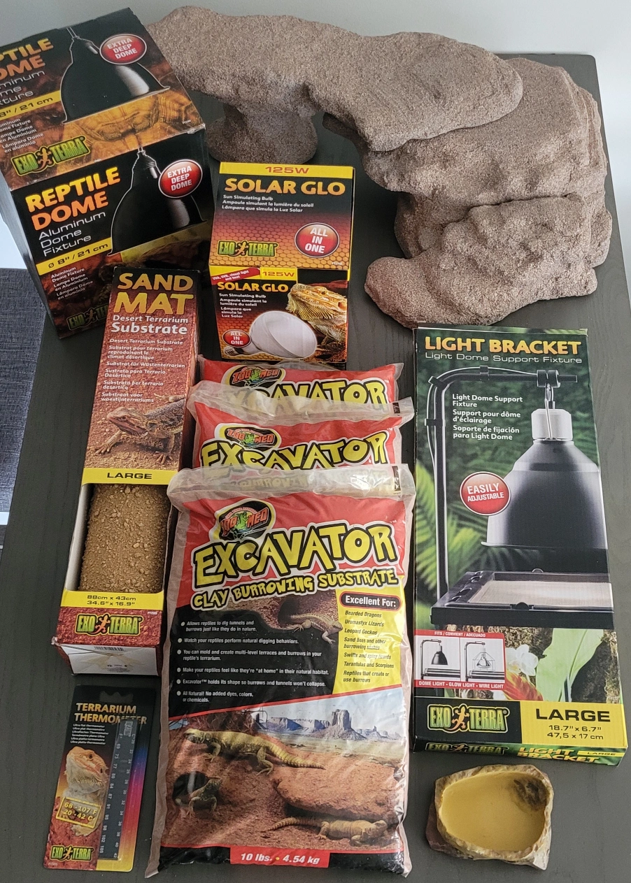 Selling a complete set of reptile terrarium supplies from Exo Terra! This includes: - Exo Terra Terrarium - Exo Terra Sand Mat Desert Terrarium Substrate - Exo Terra Excavator Clay Burrowing Substrate - Exo Terra Solar Glo - Exo Terra Reptile Dome Aluminum Fixture - Exo Terra Light Bracket - Exo Terra Thermometer - Exo Terra Water Dish Everything you need to set up a fantastic habitat for your reptile friend