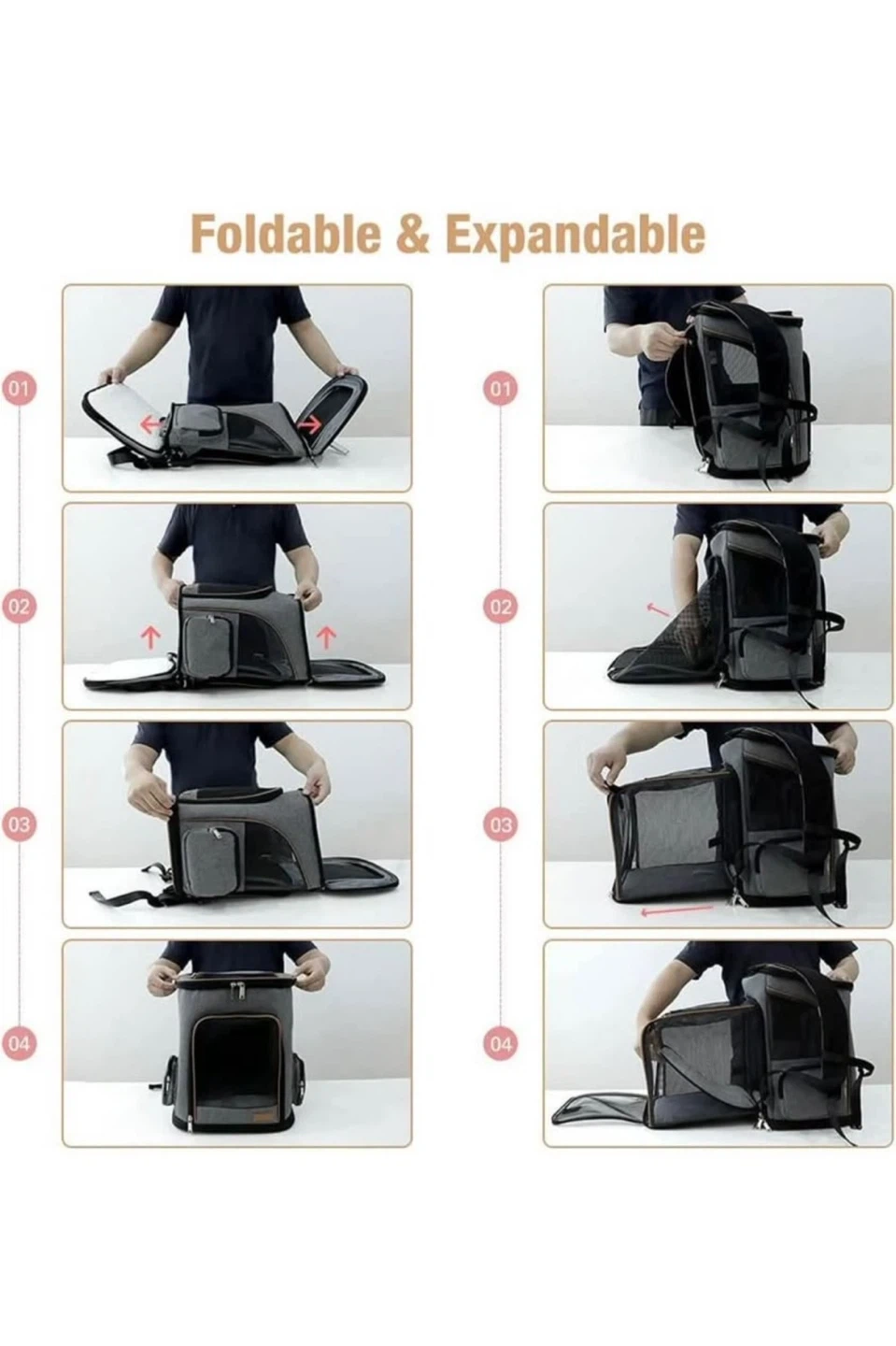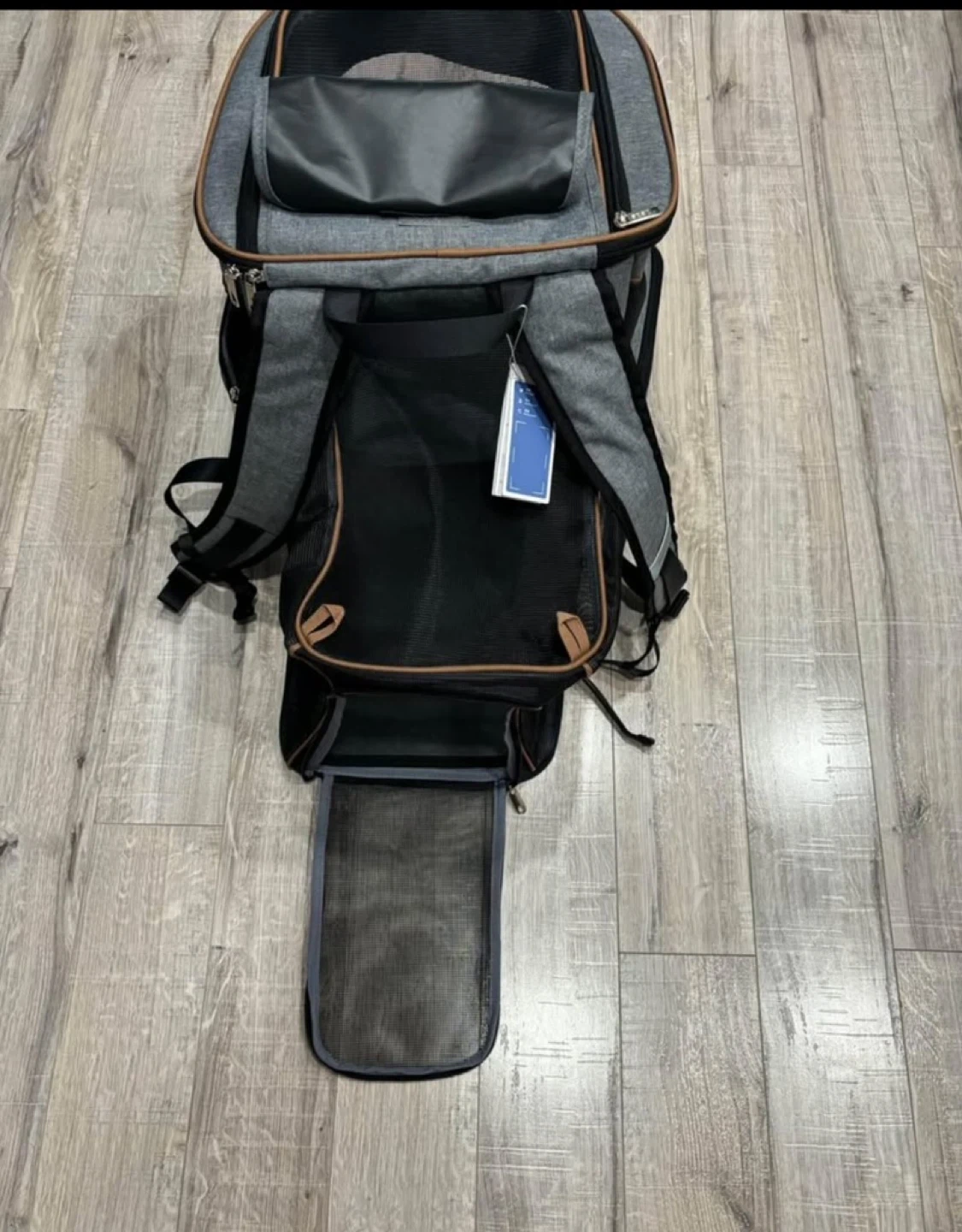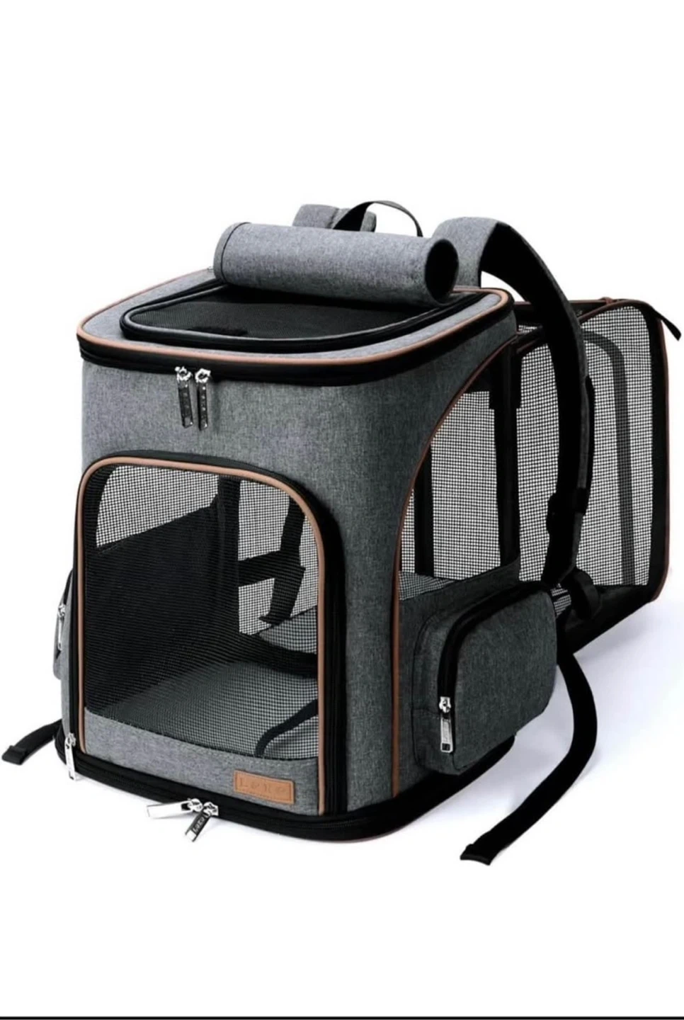 Selling a grey expandable pet carrier backpack! It has a foldable and expandable design for comfortable carrying. It also features a honeycomb mesh sponge, padded shoulder straps, adjustable chest strap, and reflective tape