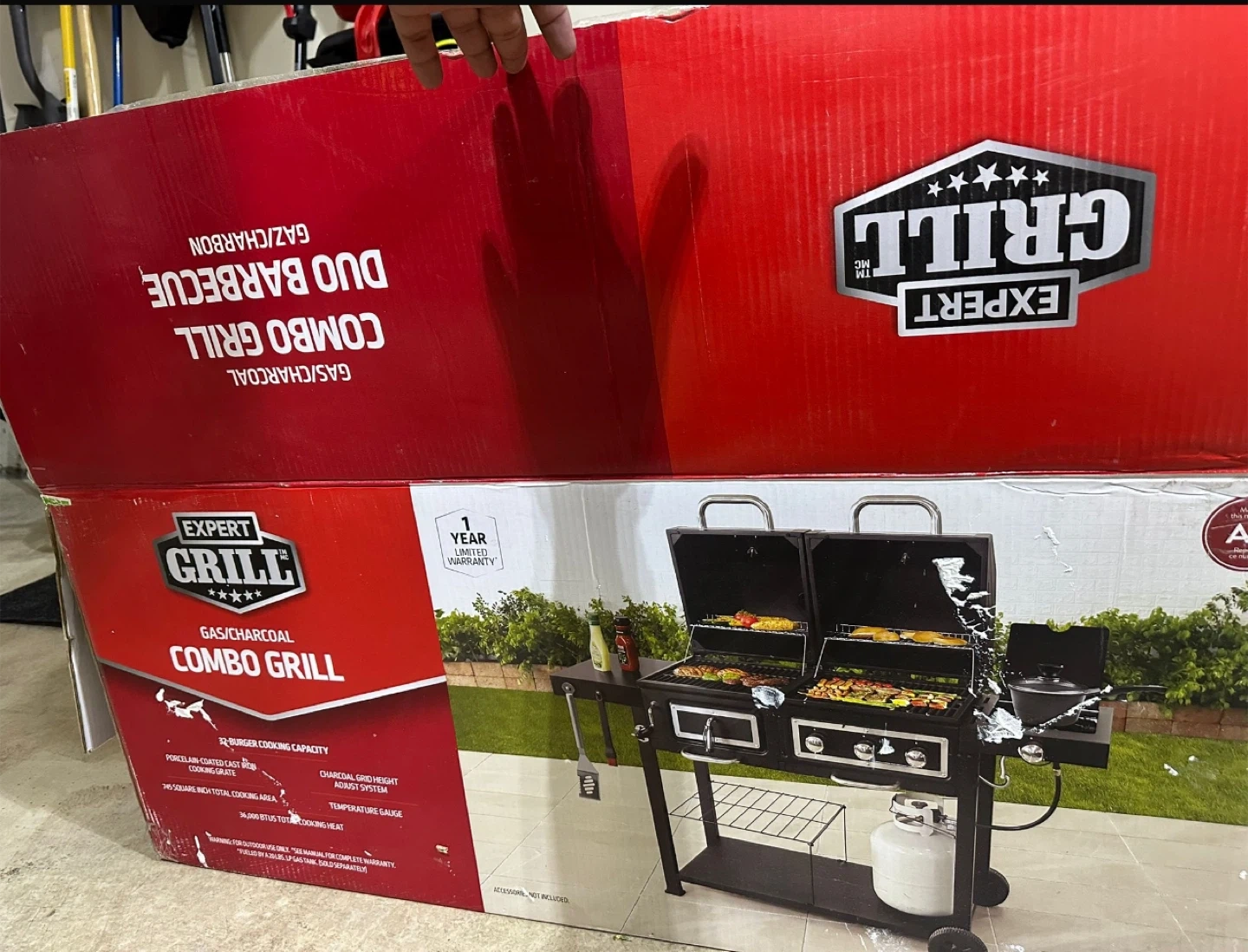 10Selling an Expert Grill combo grill that uses both gas and charcoal. It features a porcelain-coated cast iron cooking grate and a temperature gauge. The total cooking area is 745 square inches and it has a 32-burger cooking capacity. This grill also has a charcoal grid height adjustment system. Accessories are not included, and it requires a separate LP gas tank.