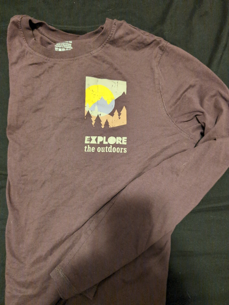 I'm selling a long-sleeve shirt with an 'Explore the Outdoors' design. It's a size 14-16 and in new condition. It features a cool graphic with a mountain scene and the words 'EXPLORE the outdoors'. dark purple but camera is not picking it up look at my bio. I am selling multiple clothing items for younger boys preteen size. willing to put things in bundles for extremely cheap. just send a message with things that you like and offers