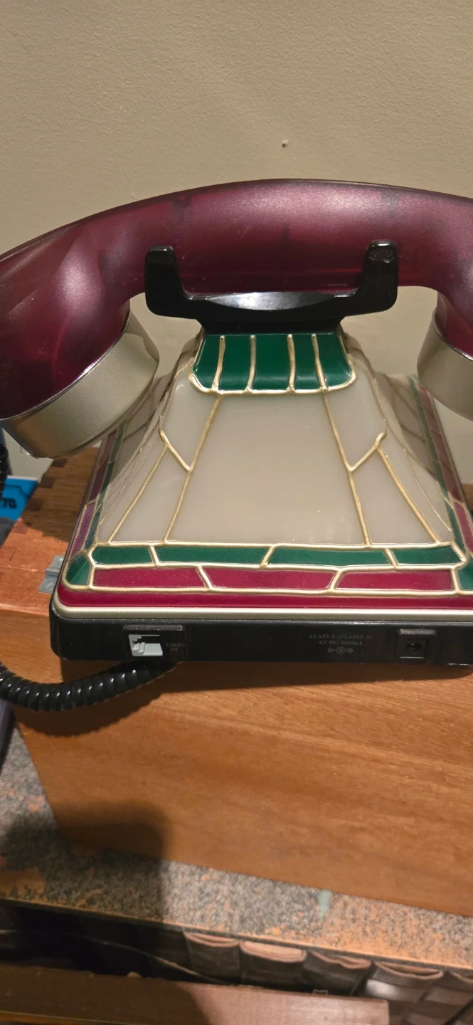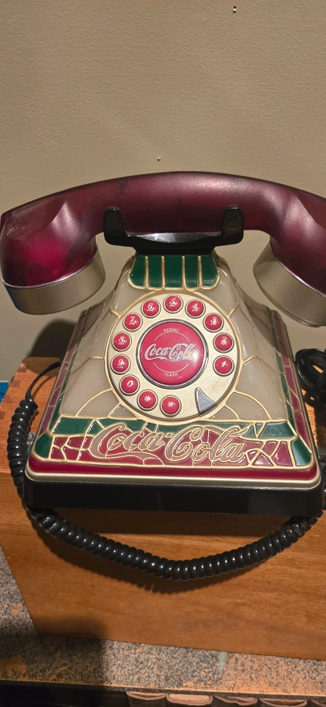 This is a decorative Coca-Cola rotary dial telephone with a stained-glass effect design. It features a classic red and white Coca-Cola logo on the front. The handset is a deep ruby colour. This phone would be a unique piece for any Coca-Cola collector or enthusiast!