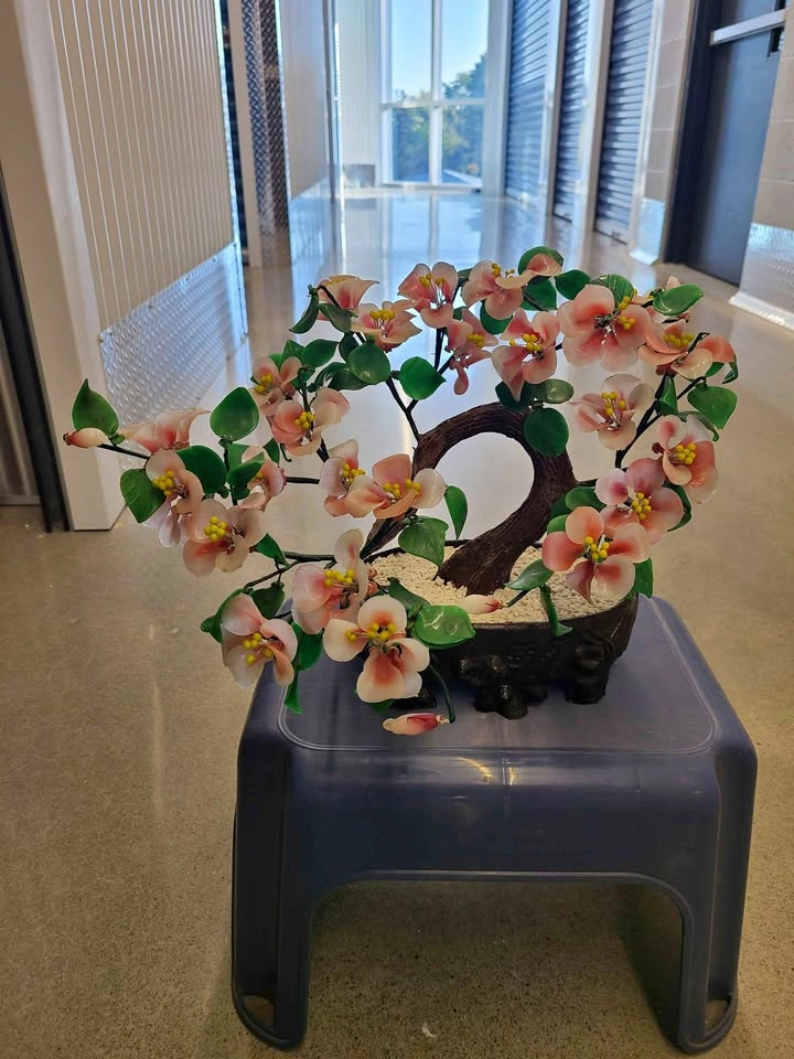 Bring a touch of serene beauty into your home with this stunning hand-carved floral bonsai sculpture! Crafted from delicate jade and agate, this piece features vibrant pink blossoms and lush green leaves, meticulously arranged on a realistic "tree" trunk. Potted in an elegant dark base, it sits atop a bed of white decorative stones. Pickup Only.