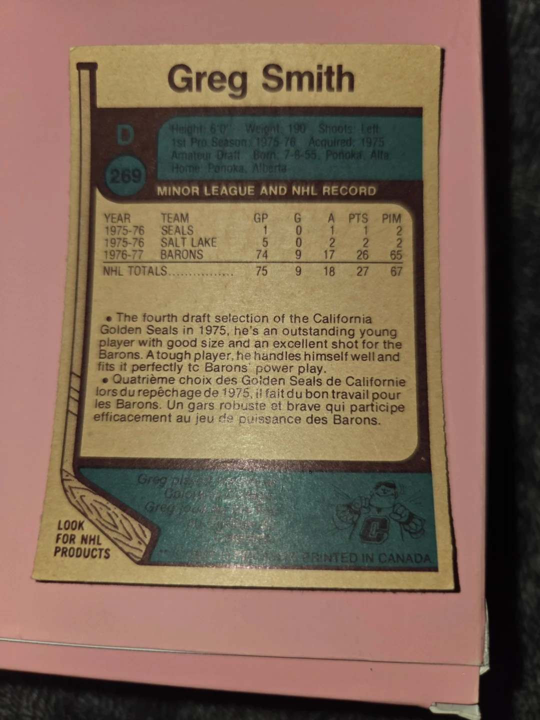 1975-76 O-Pee-Chee Greg Smith Hockey Card with stats