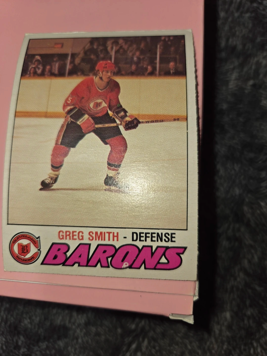 This is a 1975-76 O-Pee-Chee hockey card featuring Greg Smith, a defenseman for the Barons. It highlights his career stats and a brief description of his playing style. The card was printed in Canada.
