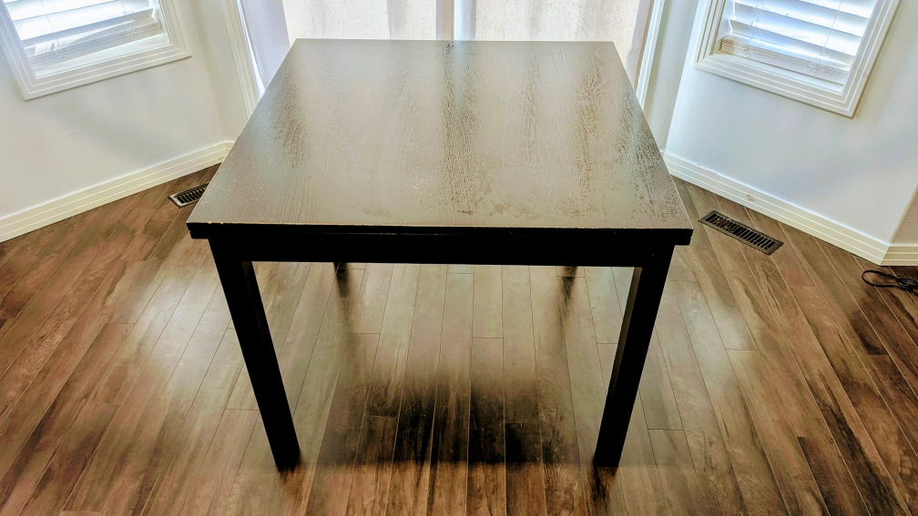 Dining table can seat 6 people and can fold into a small dining table. It's in good condition with minor scruffs. It can be extended for extra space when needed. Perfect for a small dining area or kitchen! $50 obo.