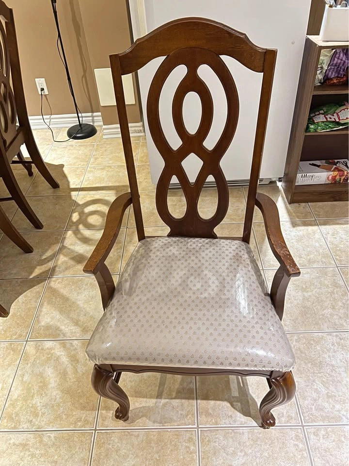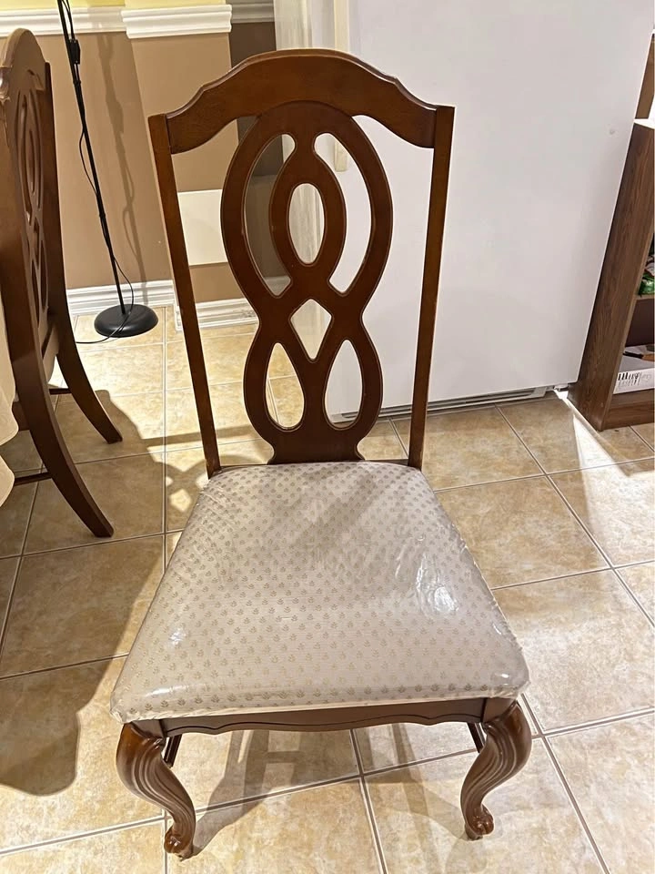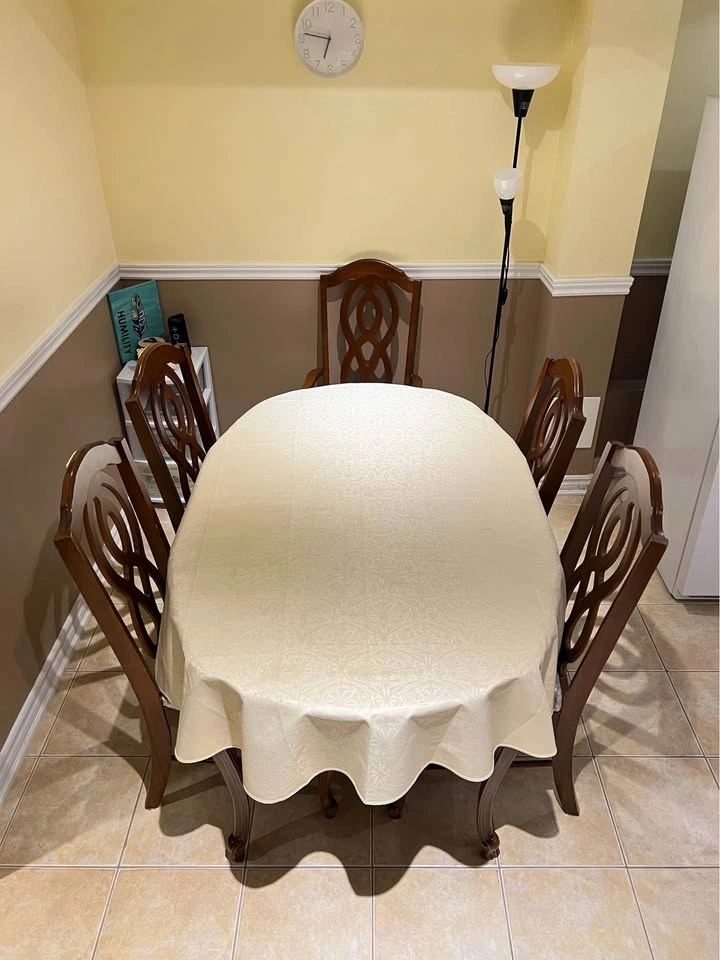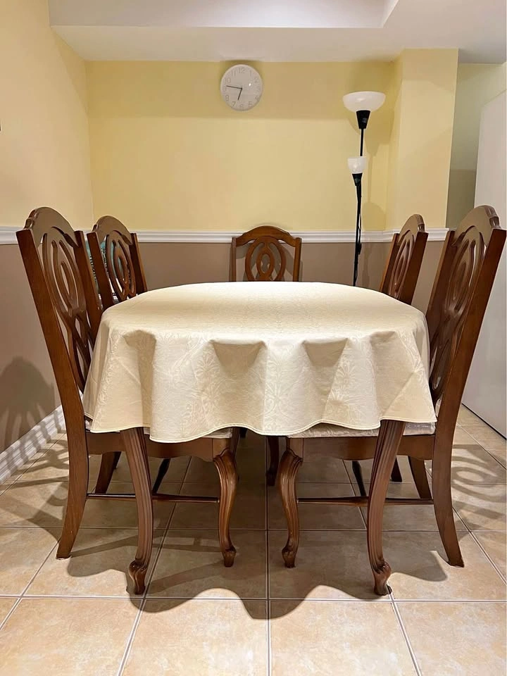We are moving so we need to sell this Wooden Dining set as it's not a good fit for our new condo. Set includes: - 1 extendable table (comes with a leaf) - 4 armless chairs - 1 chair with arm - 1 table cloth giveaway Set is in very good condition, with 5 chairs still have plastic wrap. Smoke-free, pet-free household. The set is heavy and you need to move from a basement. Pick up near Steeles Ave. E/ Birchmount Rd.