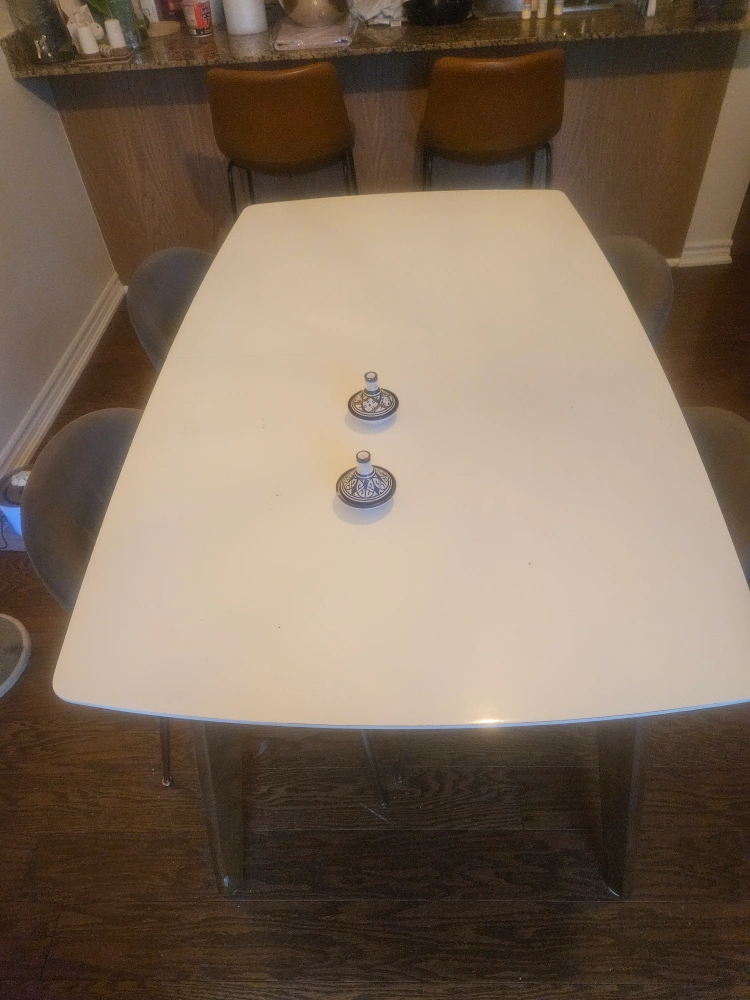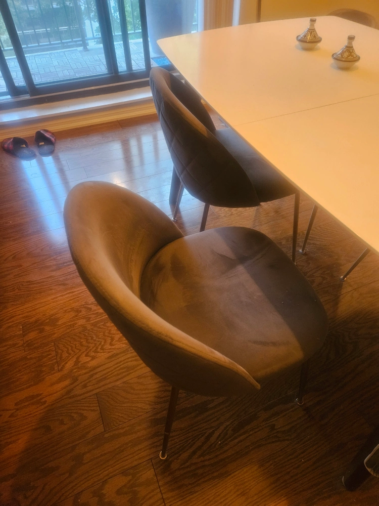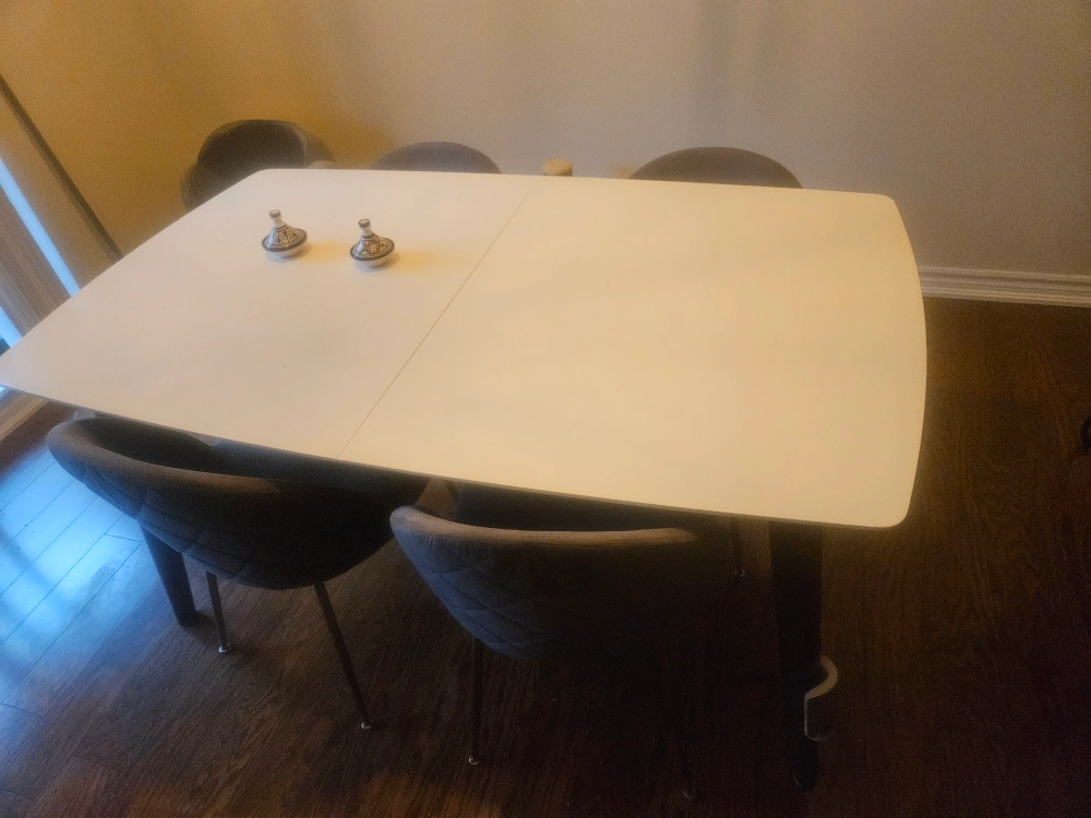 Selling an extendable dining table with four stylish grey chairs. The chairs have a unique design and would look great in any dining room or kitchen. The table is in good condition and ready for a new home!