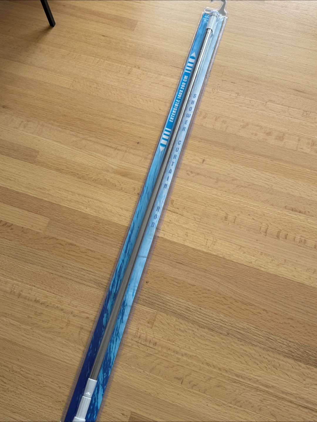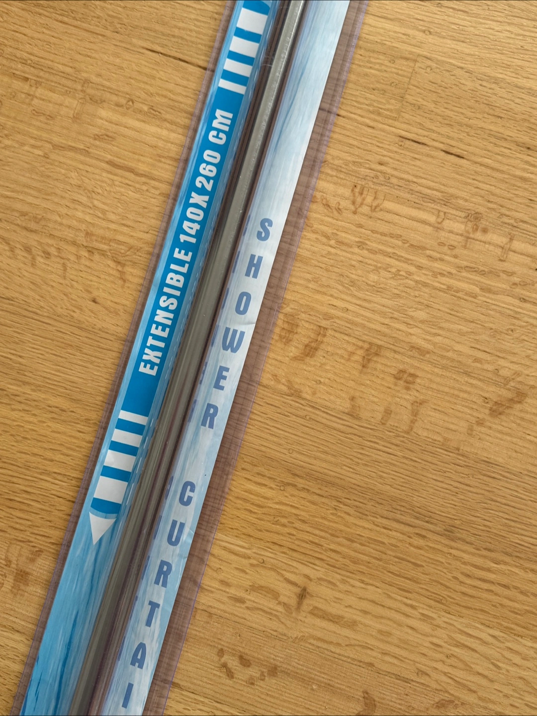 New extendable shower curtain rod. Measures 140 to 260 cm. Silver coloured metal. Perfect for bathrooms.
