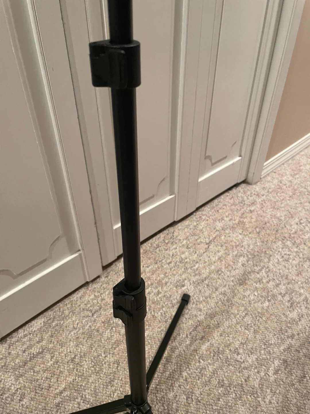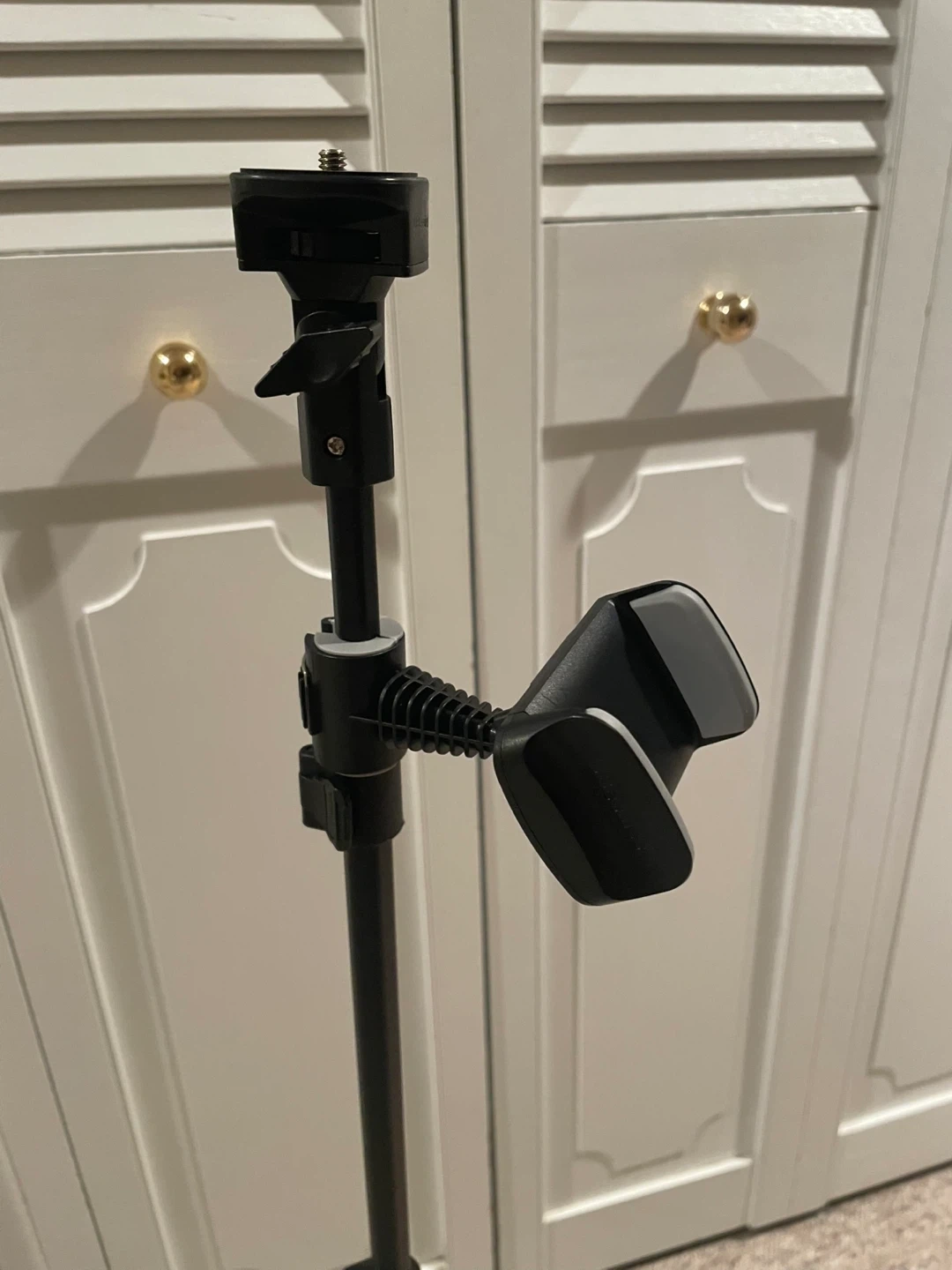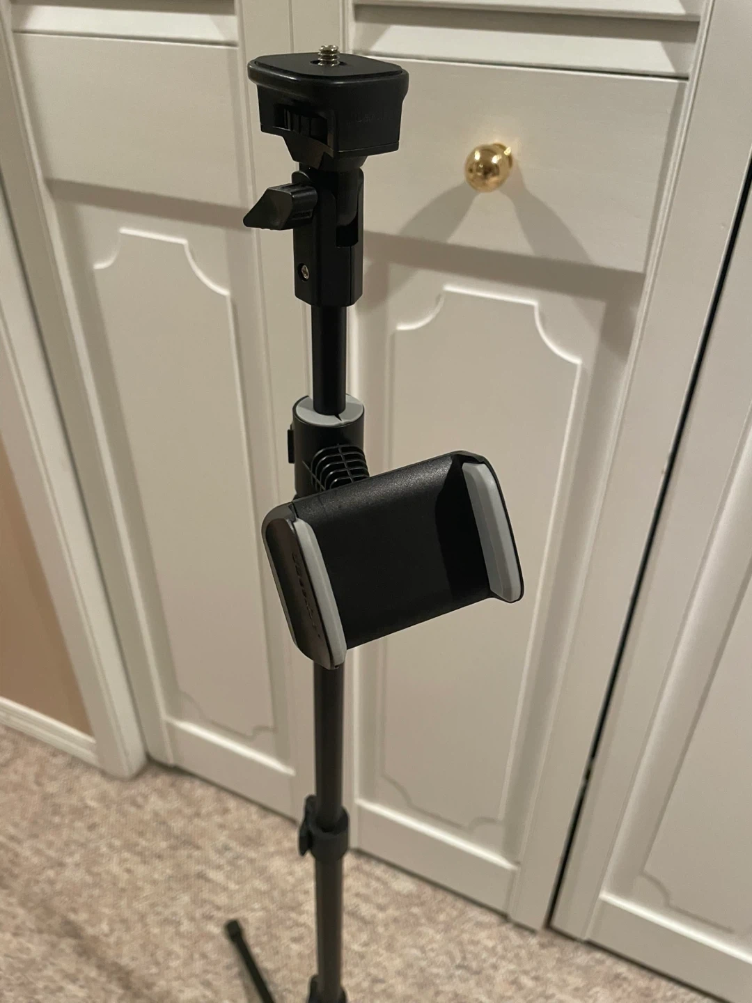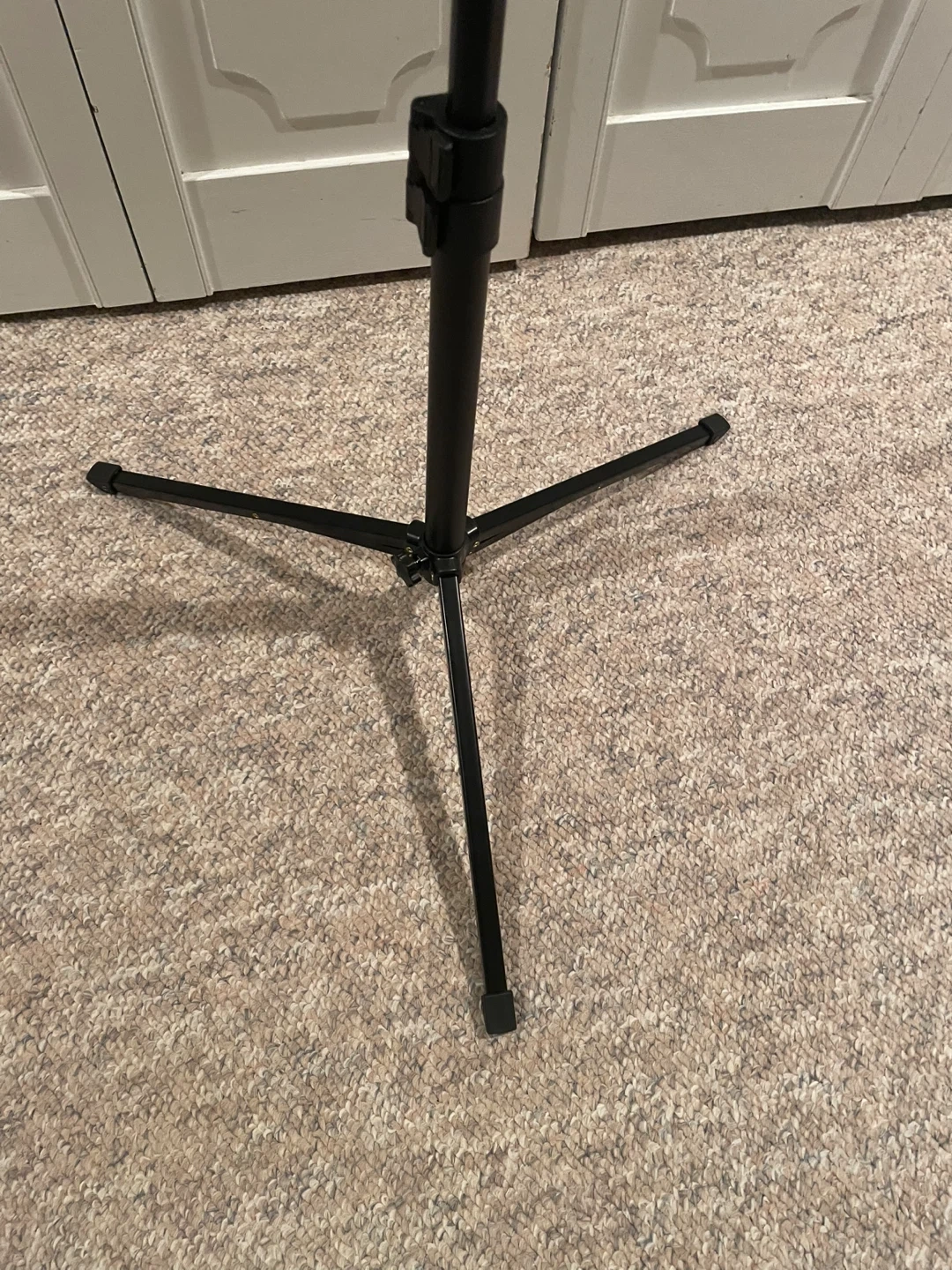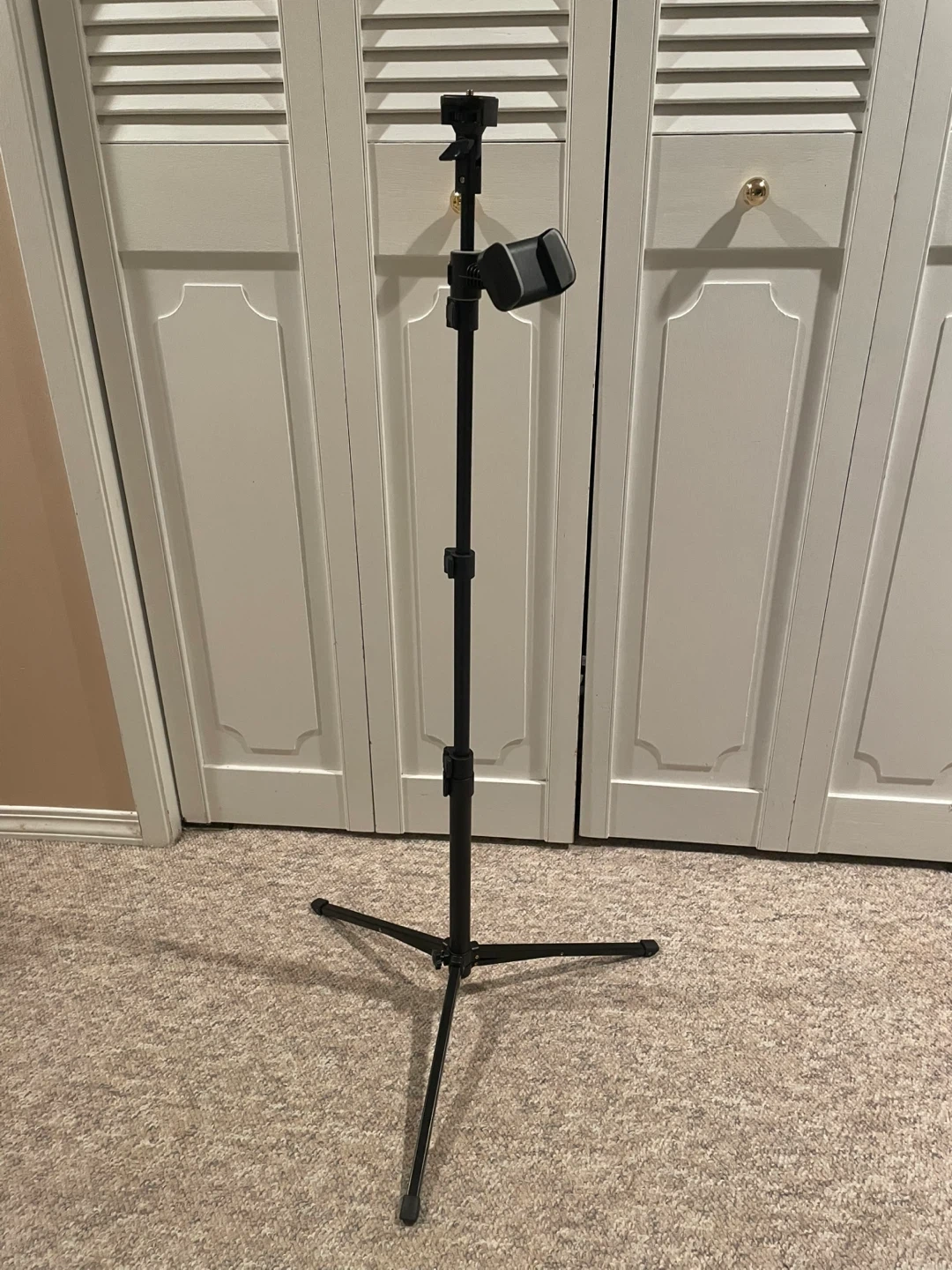 31Tripod stand with a phone holder attachment. Featuring a tripod base and adjustable height, allowing it to be used for various purposes such as live streaming or video recording. It has a zinc die-cast tripod base with rubber feet for stability. The legs are foldable for easy storage and transport. The top screw mount is 1/4", making it compatible with various devices including phone holders, DSLR cameras, and action cameras. Pick up in East Kildonan, cash please, no delivery