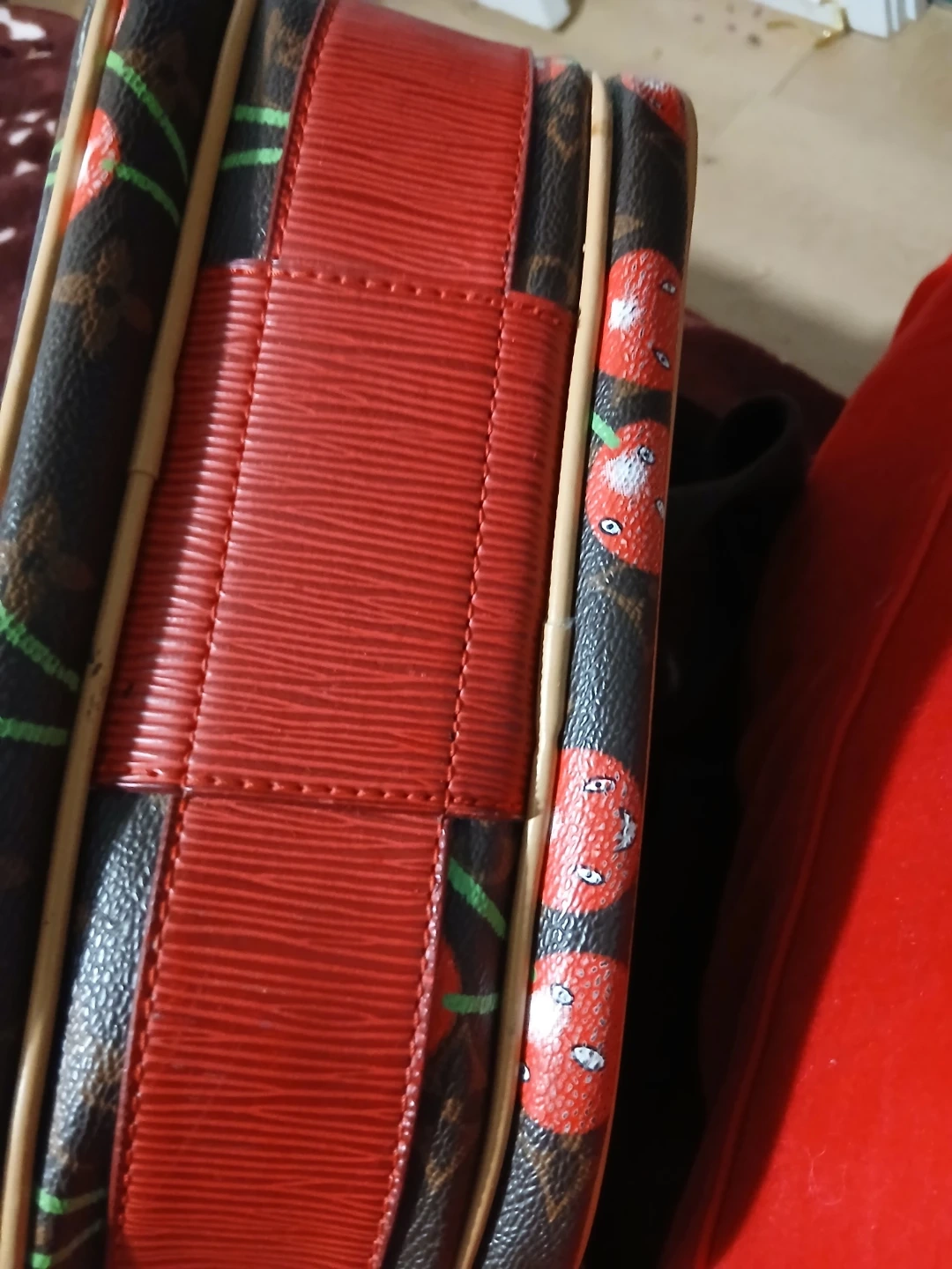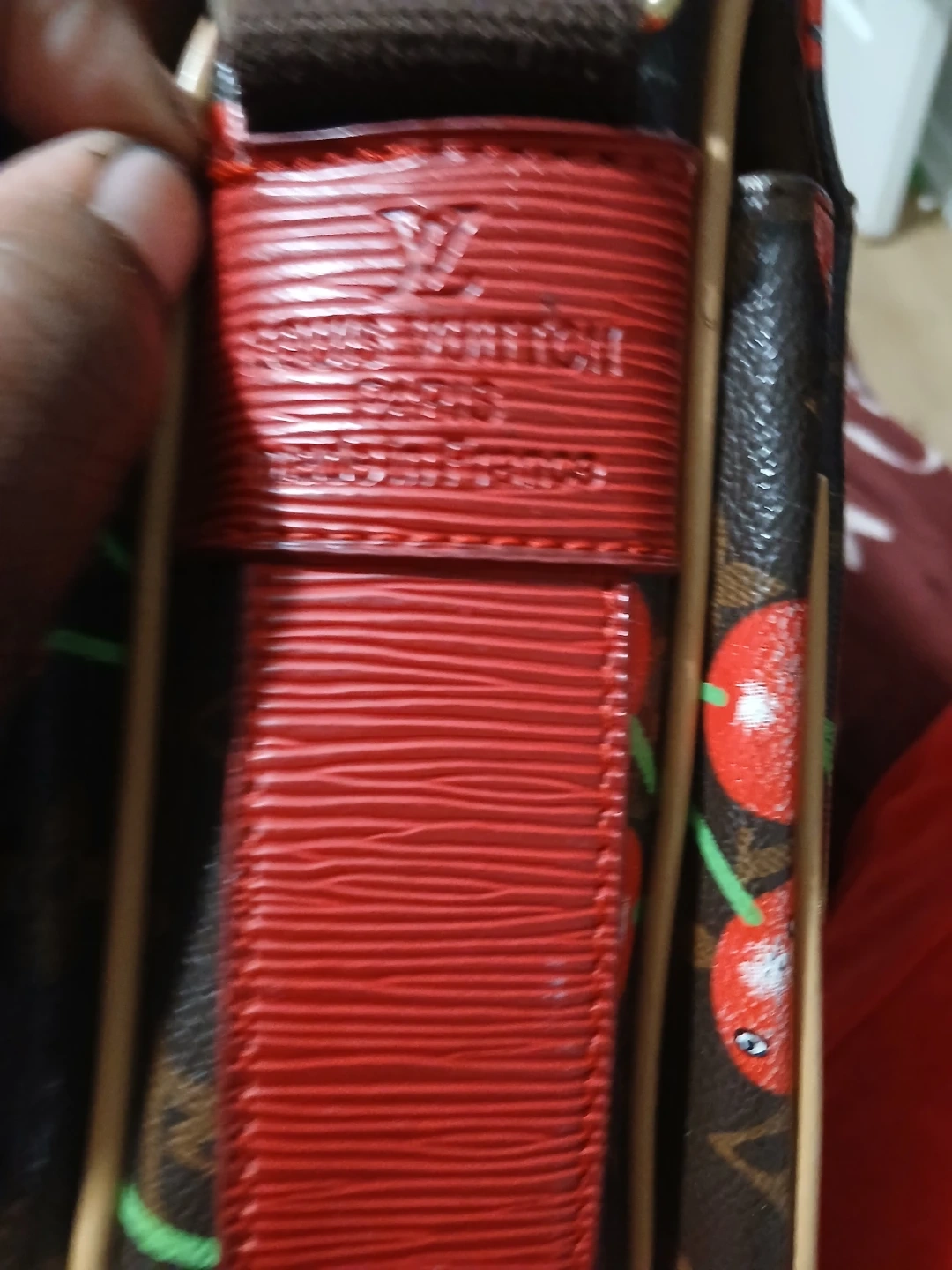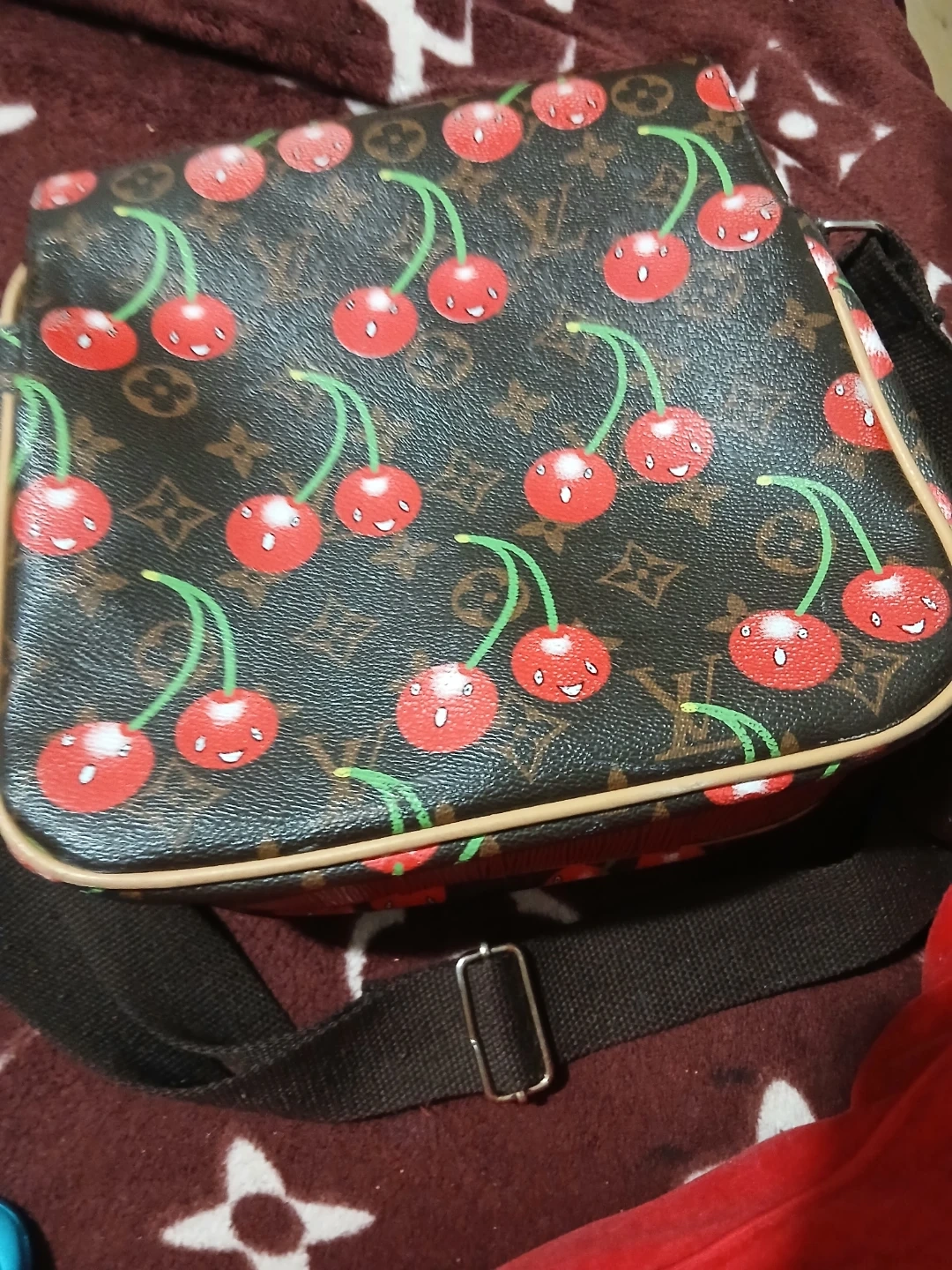 This Louis Vuitton messenger bag showcases the iconic monogram print with a playful cherry motif. It features a durable canvas exterior and red leather trim. The adjustable strap ensures comfortable wear...pick up dayspring circle brampton