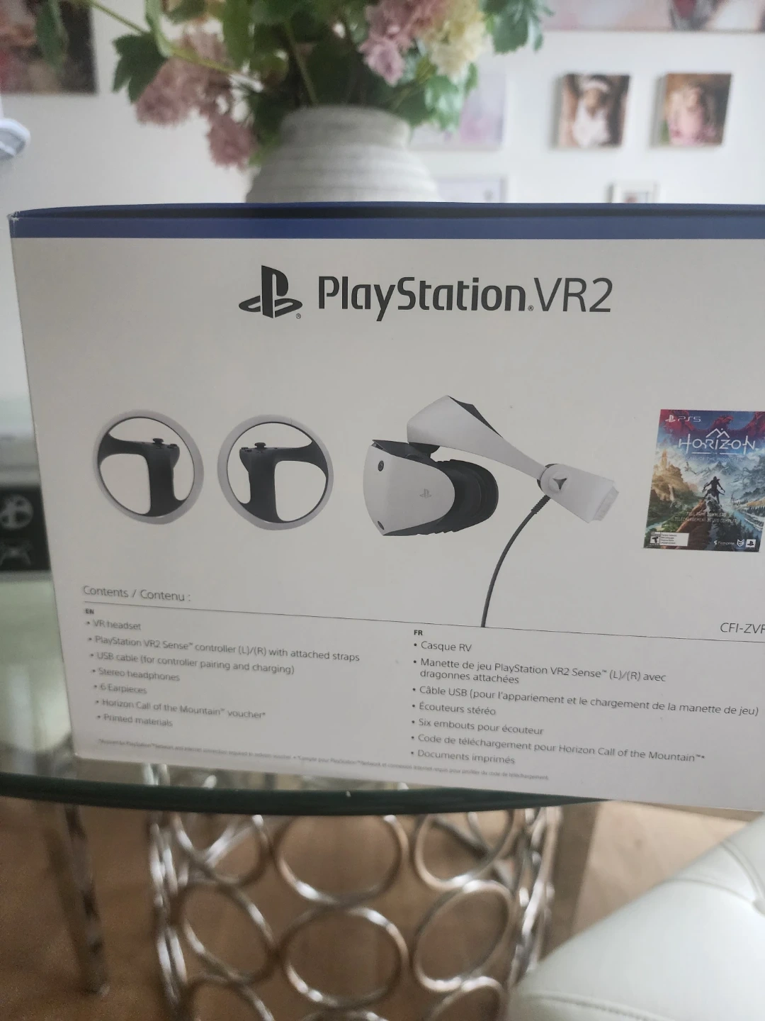 This is the PlayStation VR2 Horizon Call of the Mountain bundle, including the VR headset and controllers. It also comes with a charging station for your Sense controllers and holder for the Virtual Reality Headset. Everything is in the original box and packaging.