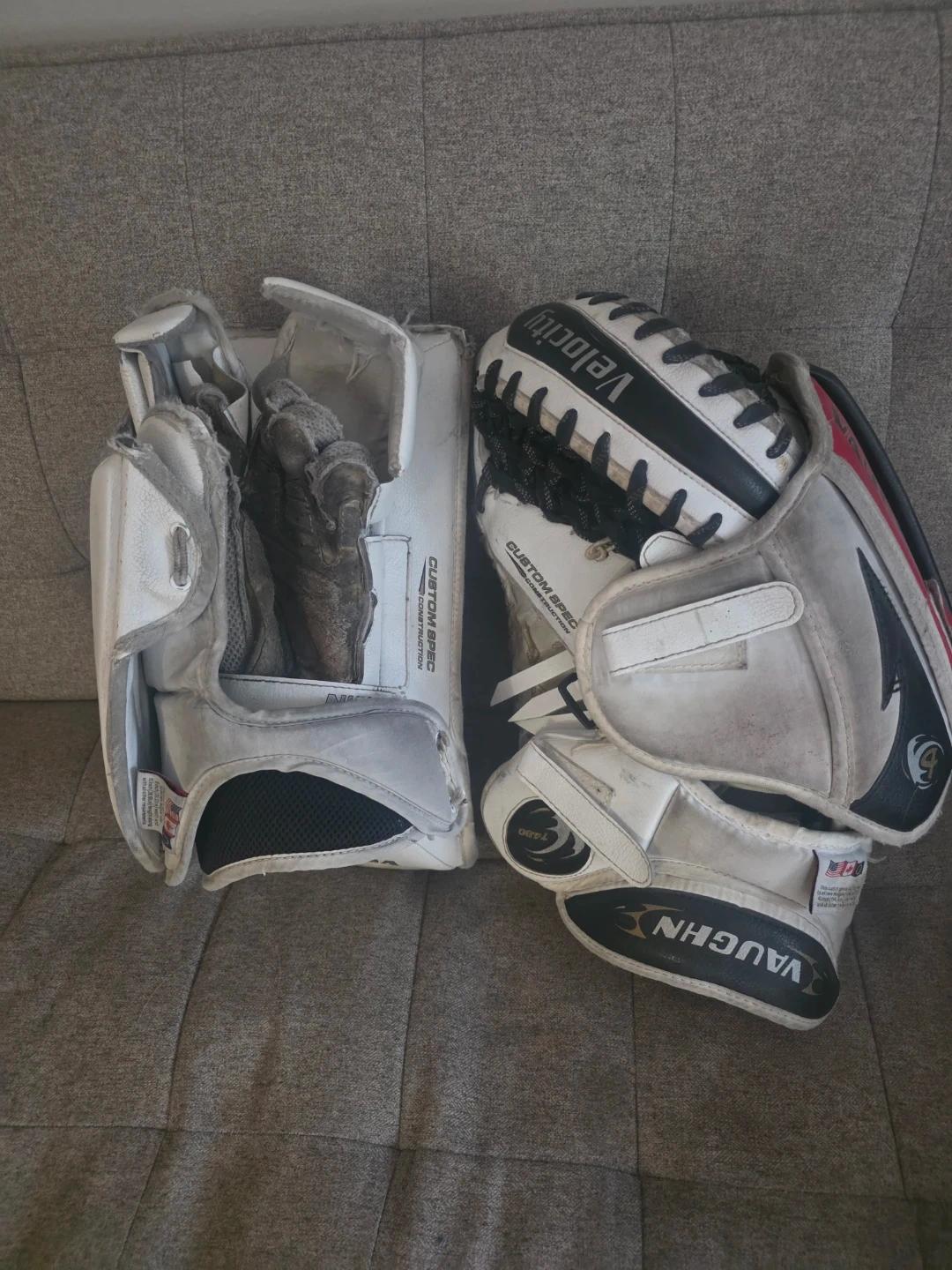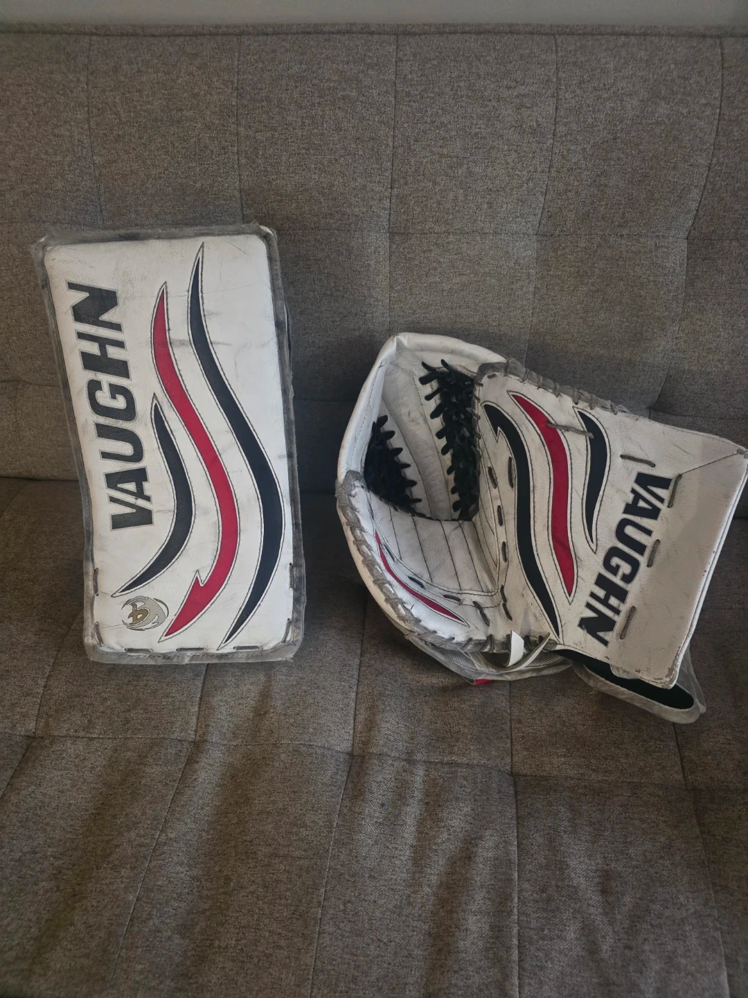 I'm selling a used Vaughn right hand catch goalie glove and blocker set.