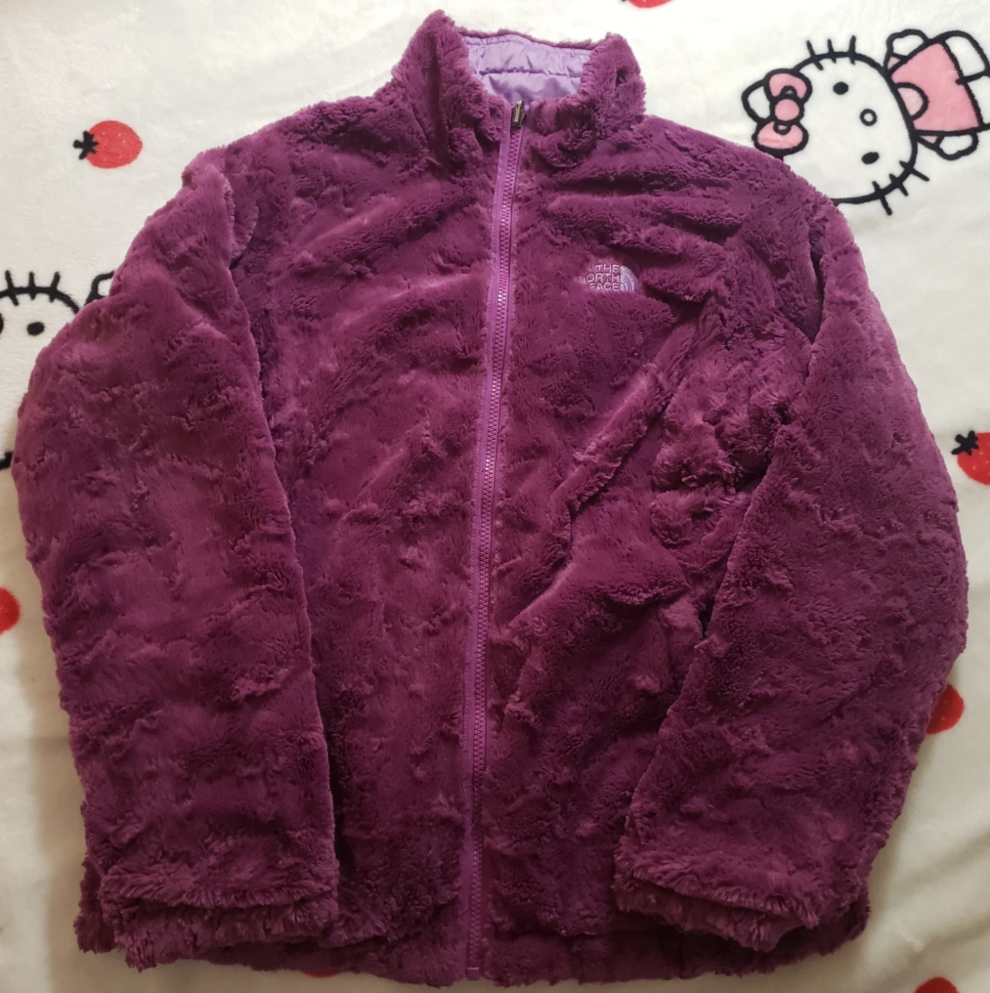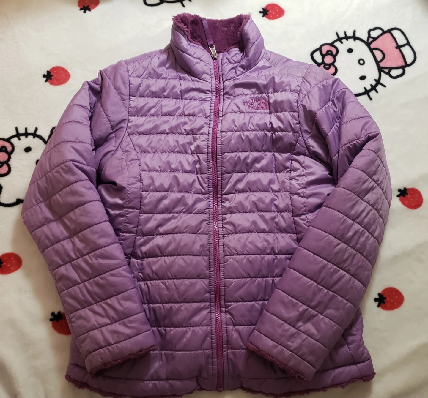 This is a reversible jacket from The North Face. One side is a purple quilted puffer, and the other is a fuzzy, plum-coloured fleece. It's perfect for staying warm on cooler days! It is in great condition and size small.