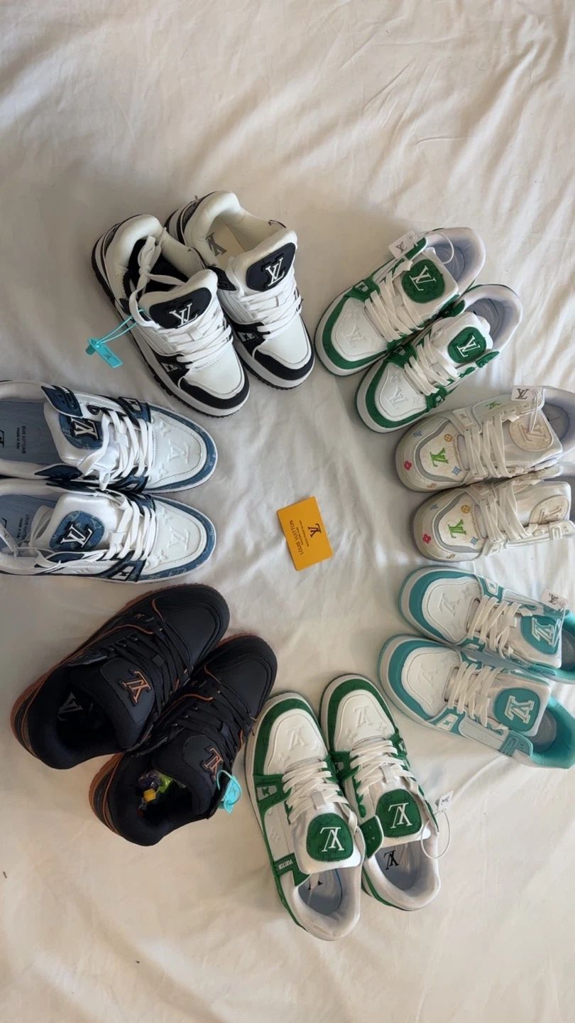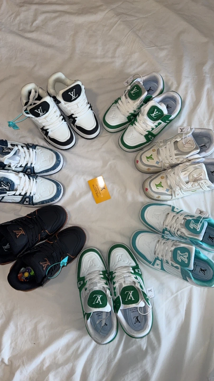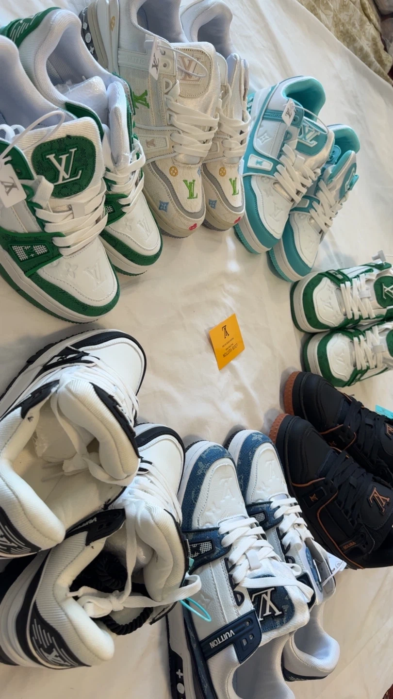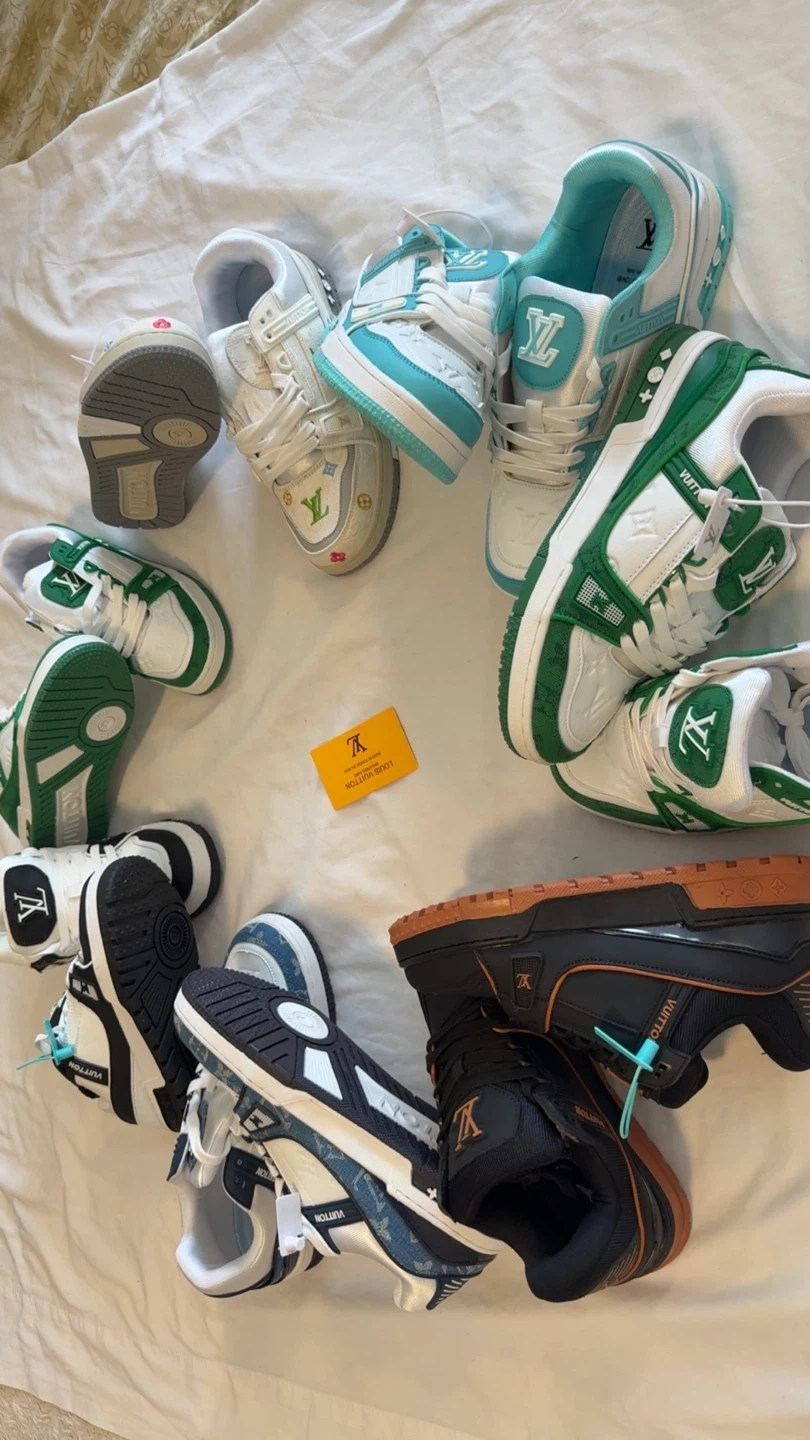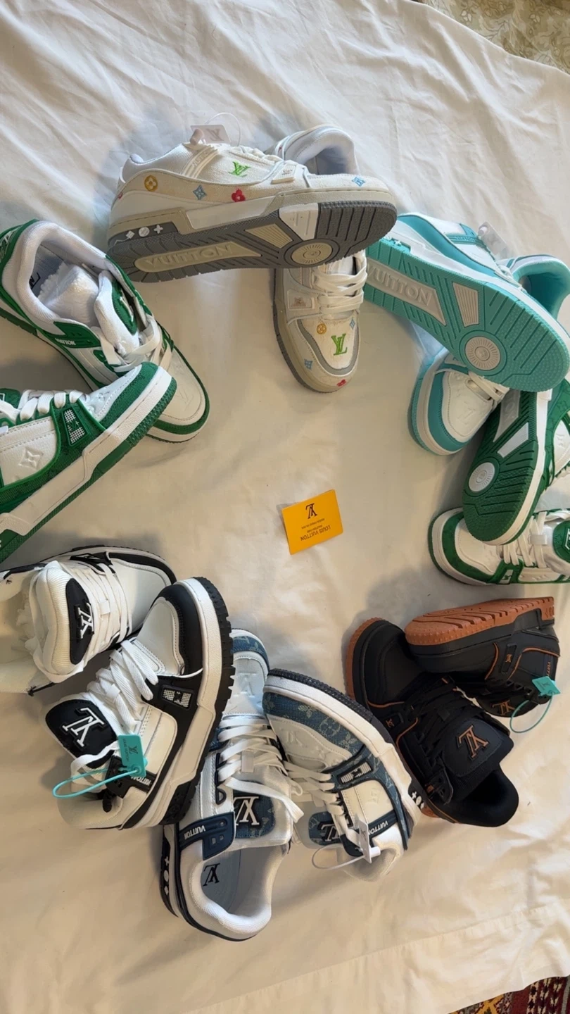 A collection of Louis Vuitton sneakers in various colourways. These are statement sneakers perfect for adding a touch of luxury to any outfit. Various sizes and styles are available.