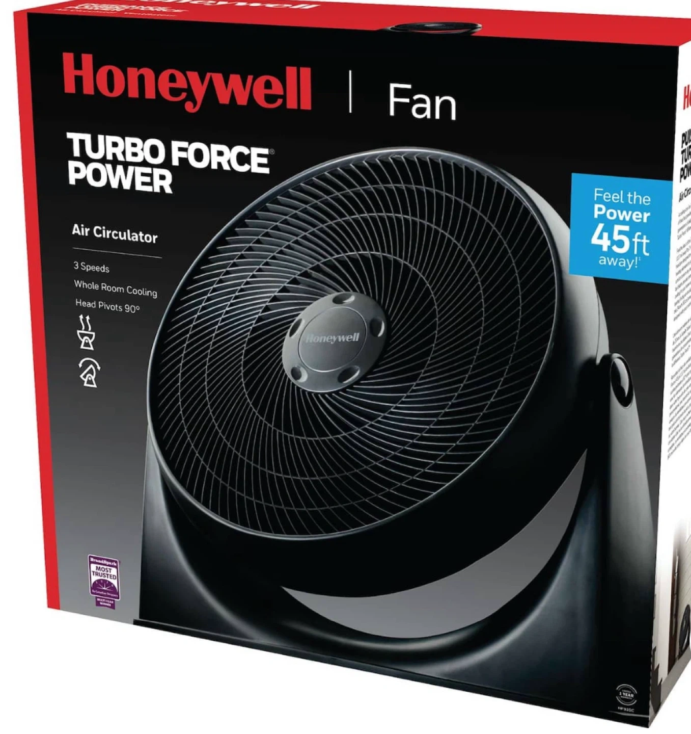 I'm selling a Honeywell Turbo Force Power Fan in black. It's an air circulator with 3 speeds and whole room cooling. The head pivots 90 degrees, and it can project air up to 45ft away! Feel the power!