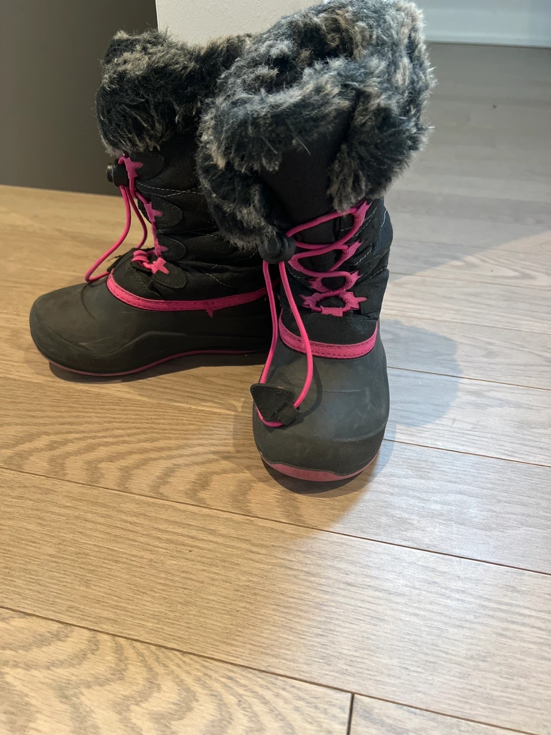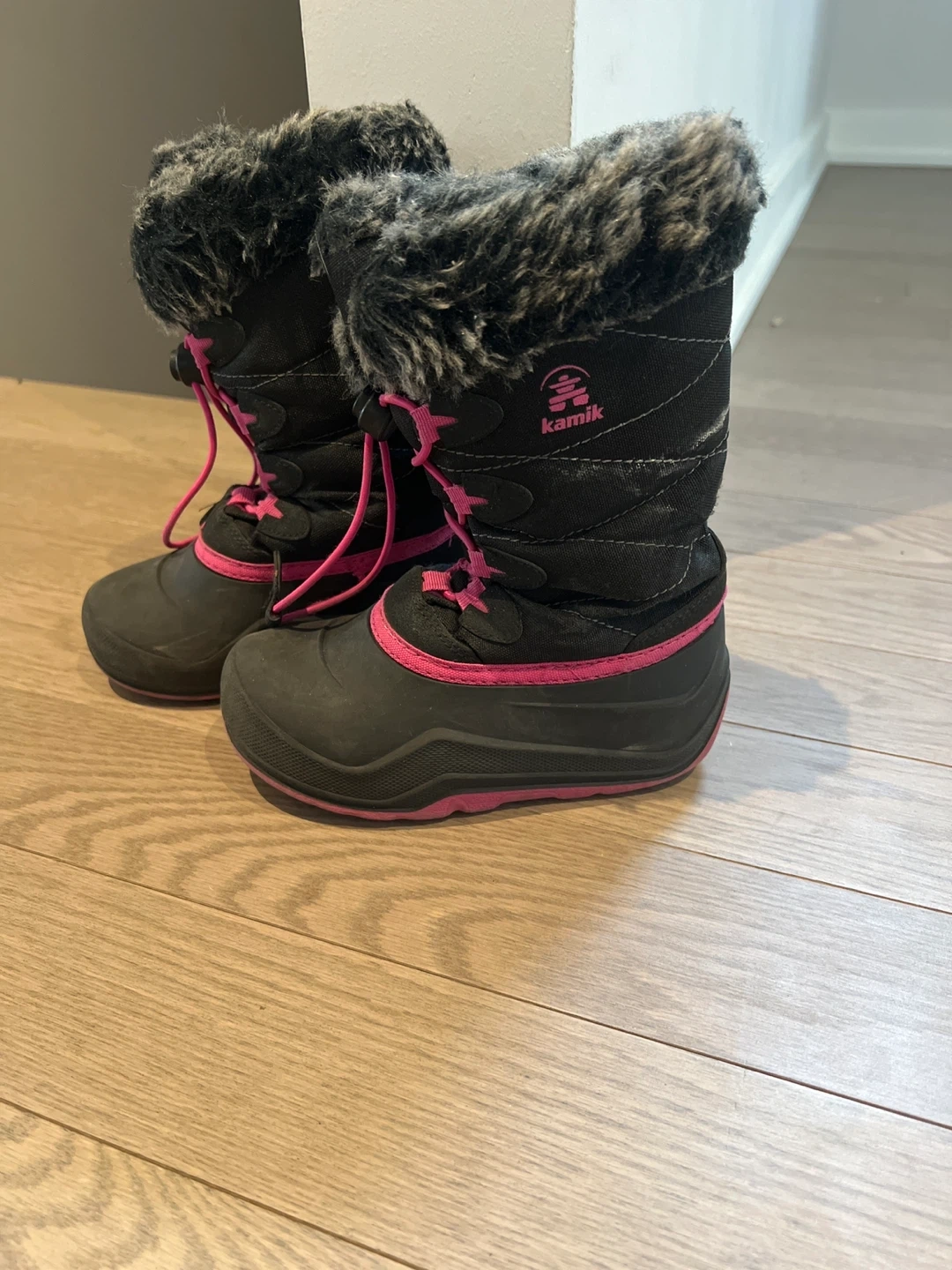 These Kamik snow boots are perfect for keeping little feet warm and dry this winter! They're black with cute pink accents and faux fur trim. The size is size 11.